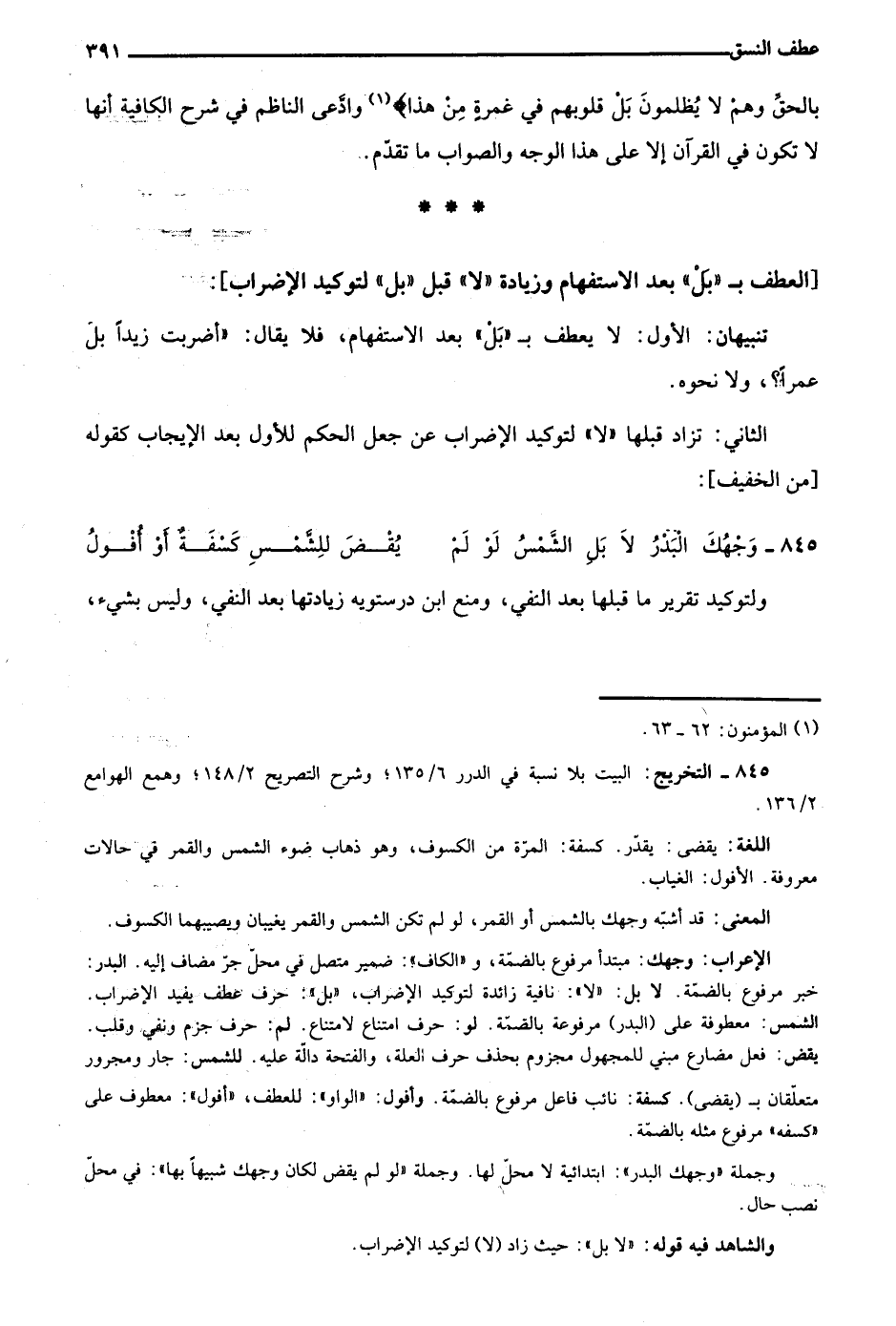 بِالْحَقِّ وَهُمْ لَا يُظْلَمُونَ، بَلْ قُلُوبُهُمْ فِي غَمْرَةٍ مِنْ هَذَا} 1 وادعى الناظم في شرح الكافية أنها لا تكون في القرآن إلا على هذا الوجه والصواب ما تقدم.