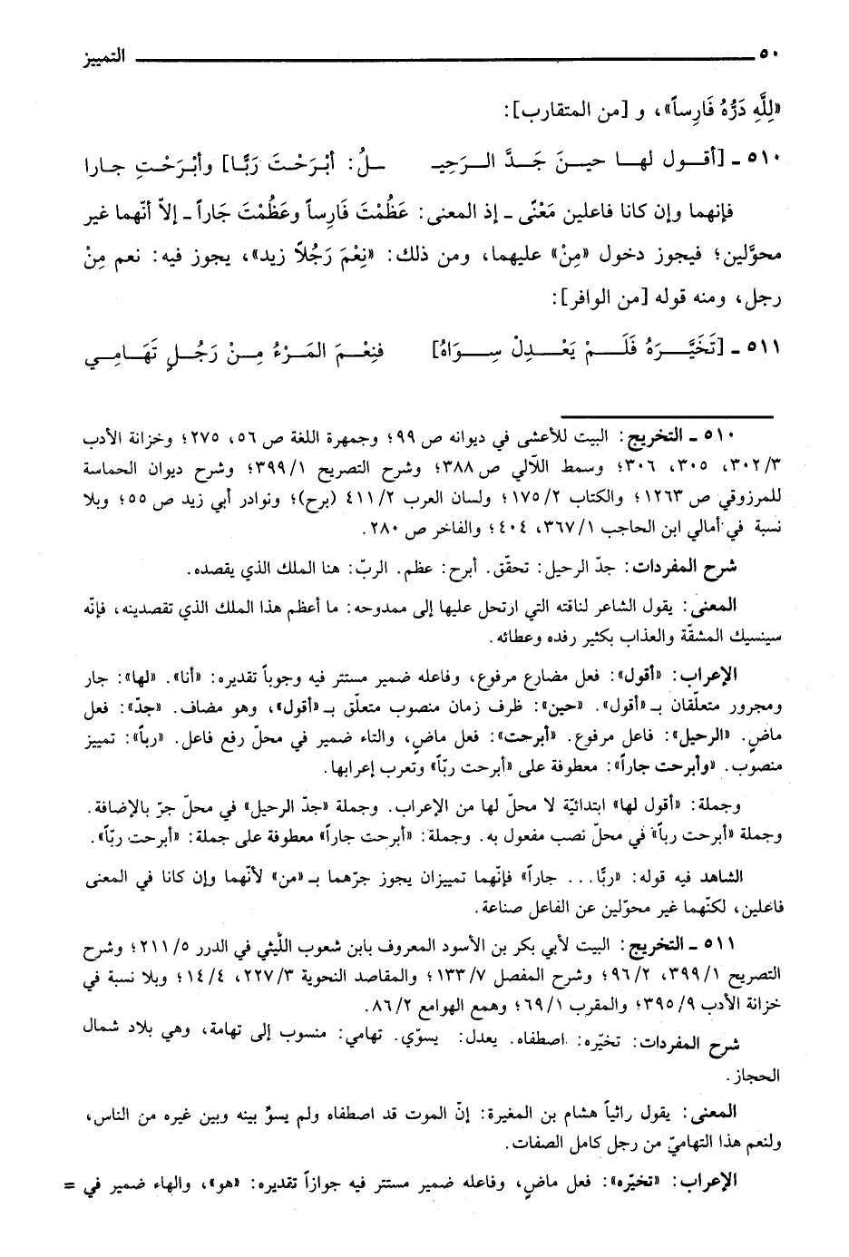 510- التخريج: البيت للأعشى في ديوانه ص99؛ وجمهرة اللغة ص56، 275؛ وخزانة الأدب 3/ 302، 305، 306؛ وسمط اللآلي ص388؛ وشرح التصريح 1/ 399؛ وشرح ديوان الحماسة للمرزوقي ص1263؛ والكتاب 2/ 175؛ ولسان العرب 2/ 411 "برح"؛ ونوادر أبي زيد ص55؛ وبلا نسبة في أمالي ابن الحاجب 1/ 367، 404؛ والفاخر ص280.