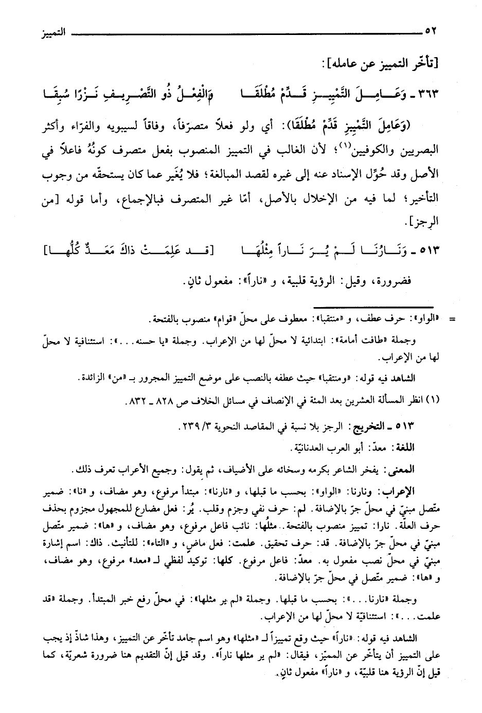 الشاهد فيه قوله: "نارًا" حيث وقع تمييزًا لـ"مثلها" وهو اسم جامد تأخر عن التمييز، وهذا شاذ إذ يجب على التمييز أن يتأخر عن المميز، فيقال: "لم ير مثلها نارًا". وقد قيل إن التقديم هنا ضرورة شعرية، كما قيل إن الرؤية هنا قلبية، و"نارًا" مفعول ثان.