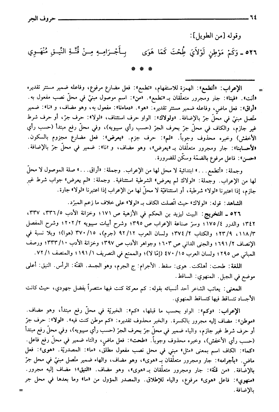 الإعراب: "وكم": الواو بحسب نما قبلها، "كم": الخبرية في محل رفع مبتدأ، وهو مضاف "موطن": مضاف إليه مجرور بالكسرة والخبر محذوف تقديره: "كم موطن كنت فيه". "لولا": حرف جر أو حرف شرط غير جازم، والياء ضمير في محل جر بحرف الجر "حسب رأي سيبويه"، وفي محل رفع مبتدأ "حسب رأي الأخفش"، وخبره محذوف وجوبًا. "طحت": فعل ماض، والتاء ضمير في محل رفع فاعل. "كما": الكاف اسم بمعنى "مثل" مبني في محل نصب مفعول مطلق، "ما: المصدرية. "هوى": فعل ماض. "بأجرامه": جار ومجرور متعلقان بـ"هوى"، وهو مضاف، والهاء ضمير متصل مبني في محل جر بالإضافة. "من قنة": جار ومجرور متعلقان بـ"هوى"، وهو مضاف. "النيق"؛ مضاف إليه مجرور. "منهوي": فاعل "هوى" مرفوع، والياء للإطلاق. والمصدر المؤول من "ما" وما بعدها في محل جر بالإضافة.