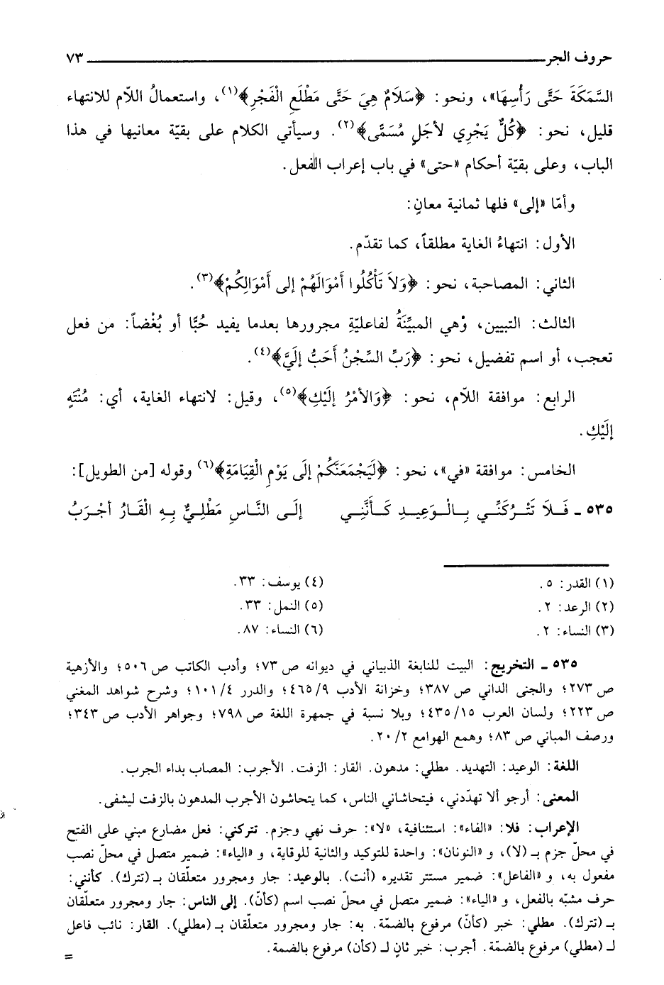 السمكة حتى رأسها"، ونحو: {سَلَامٌ هِيَ حَتَّى مَطْلَعِ الْفَجْر} 1، واستعمال اللام للانتهاء قليل، نحو: {كُلٌّ يَجْرِي لِأَجَلٍ مُسَمًّى} 2. وسيأتي الكلام على بقية معانيها في هذا الباب، وعلى بقية أحكام "حتى" في باب إعراب الفعل.