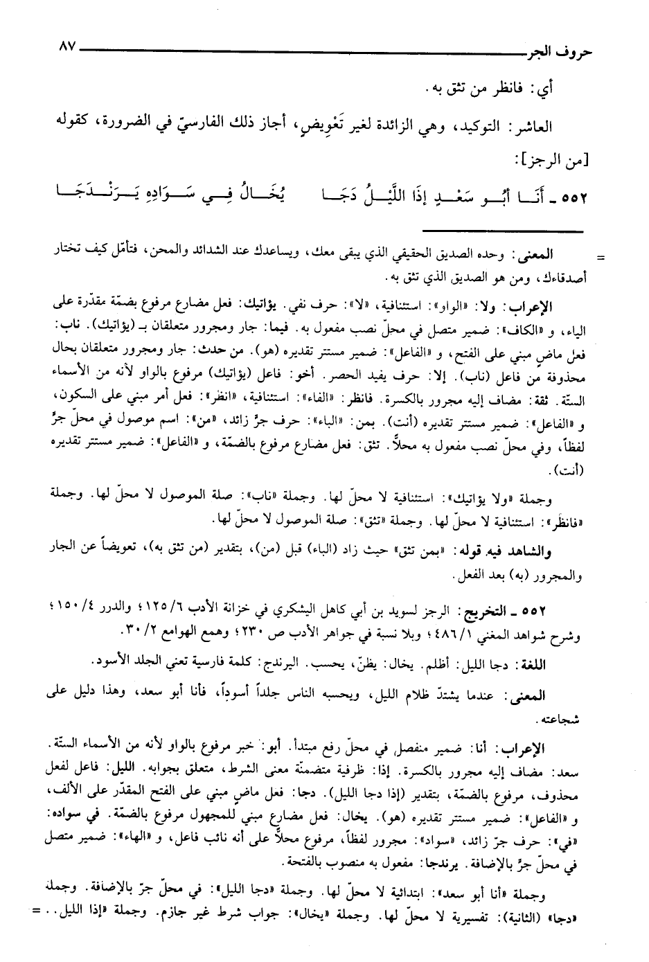 الإعراب: أنا: ضمير منفصل في محل رفع مبتدأ. أبو: خبر مرفوع بالواو لأنه من الأسماء الستة. سعد: مضاف إليه مجرور بالكسرة. إذا: ظرفية متضمنة معنى الشرط، متعلق بجوابه. الليل: فاعل لفعل محذوف، مرفوع بالضمة، بتقدير "إذا دجا الليل". دجا: فعل ماضٍ مبني على الفتح المقدر على الألف و"الفاعل": ضمير مستتر تقديره "هو". يخال: فعل مضارع مبني للمجهول مرفوع بالضمة. في سواده: "في": حرف جر زائد، "سواد": مجرور لفظًا، مرفوع محلًّا على أنه نائب فاعل، و"الهاء": ضمير متصل في محل جر بالإضافة. يرندجا: مفعول به منصوب بالفتحة.
