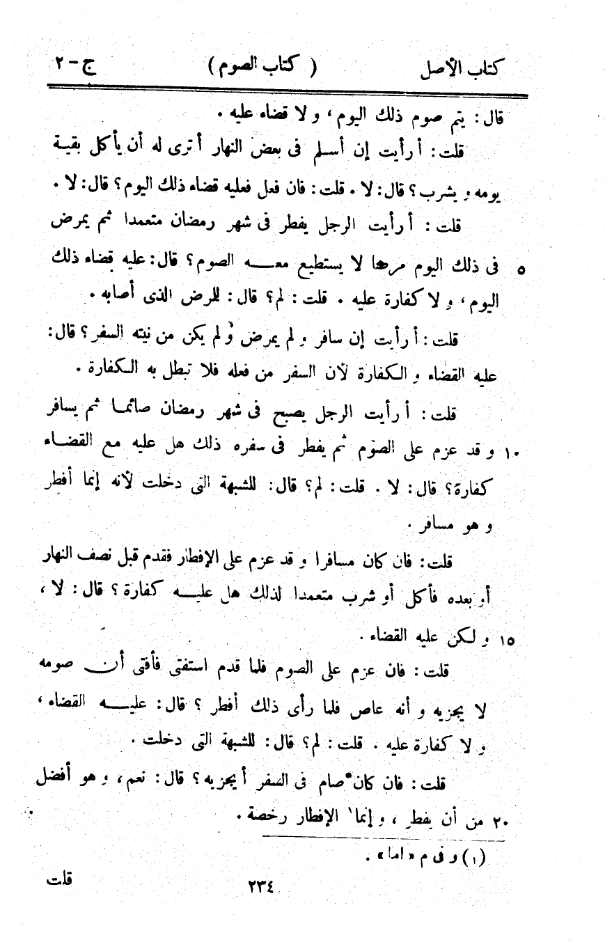 قلت أَرَأَيْت الرجل يصبح فِي شهر رَمَضَان صَائِما ثمَّ يُسَافر وَقد عزم على الصَّوْم ثمَّ يفْطر فِي سَفَره ذَلِك هَل عَلَيْهِ مَعَ الْقَضَاء كَفَّارَة قَالَ لَا قلت لم قَالَ للشُّبْهَة الَّتِي دخلت لِأَنَّهُ إِنَّمَا أفطر وَهُوَ مُسَافر