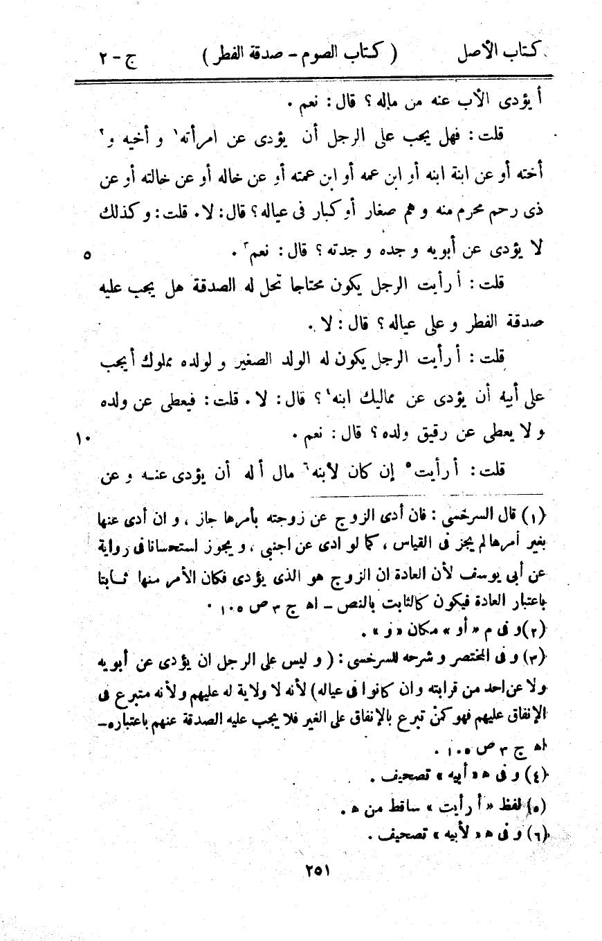 قلت فَهَل يجب على الرجل أَن يُؤَدِّي عَن امْرَأَته وأخيه وَأُخْته أَو عَن ابْنة ابْنه أَو ابْن عَمه أَو ابْن عمته أَو عَن خَاله أَو عَن خَالَته أَو عَن ذِي رحم محرم مِنْهُ وهم صغَار أَو كبار فِي عِيَاله قَالَ لَا قلت وَكَذَلِكَ لَا يُؤَدِّي عَن أَبَوَيْهِ وجده وجدته قَالَ نعم