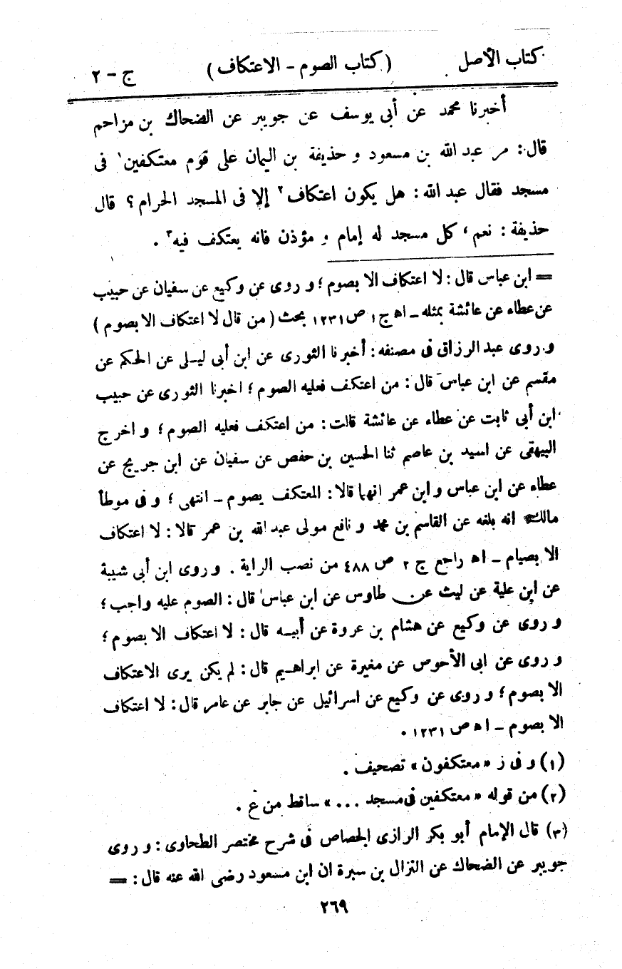 أخبرنَا مُحَمَّد عَن أبي يُوسُف عَن جُوَيْبِر عَن الضَّحَّاك بن مُزَاحم قَالَ مر عبد الله بن مَسْعُود وَحُذَيْفَة بن الْيَمَان على قوم معتكفين فِي مَسْجِد فَقَالَ عبد الله هَل يكون اعْتِكَاف إِلَّا فِي الْمَسْجِد الْحَرَام قَالَ حُذَيْفَة نعم كل مَسْجِد لَهُ إِمَام ومؤذن فَإِنَّهُ يعْتَكف فِيهِ