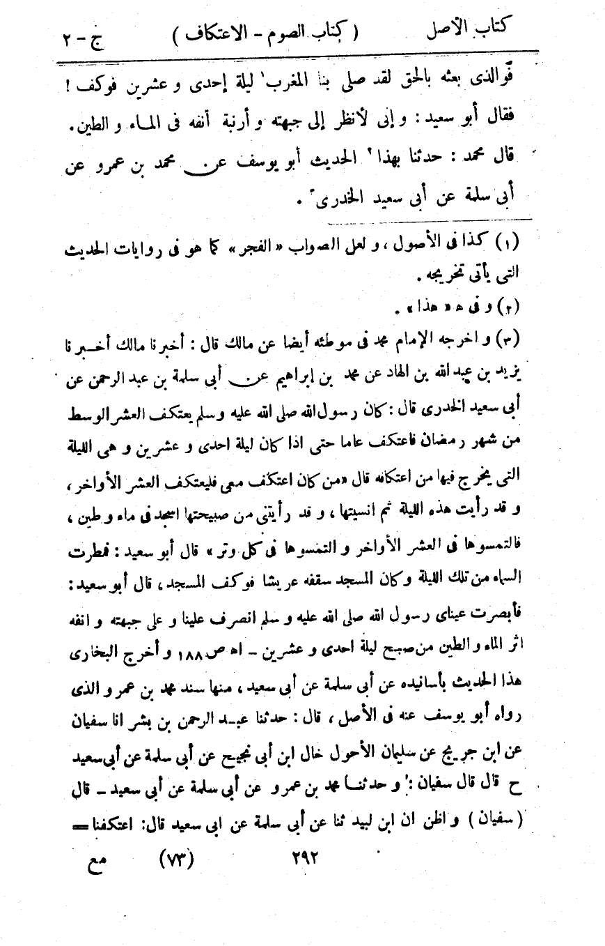 فوالذي بَعثه بِالْحَقِّ لقد صلى بِنَا الْمغرب لَيْلَة إِحْدَى وَعشْرين فوكف فَقَالَ أَبُو سعيد وَإِنِّي لأنظر إِلَى جَبهته وأرنبة أَنفه فِي المَاء والطين قَالَ مُحَمَّد حَدثنَا بِهَذَا الحَدِيث أَبُو يُوسُف عَن مُحَمَّد بن عَمْرو عَن أبي سَلمَة عَن أبي سعيد الْخُدْرِيّ