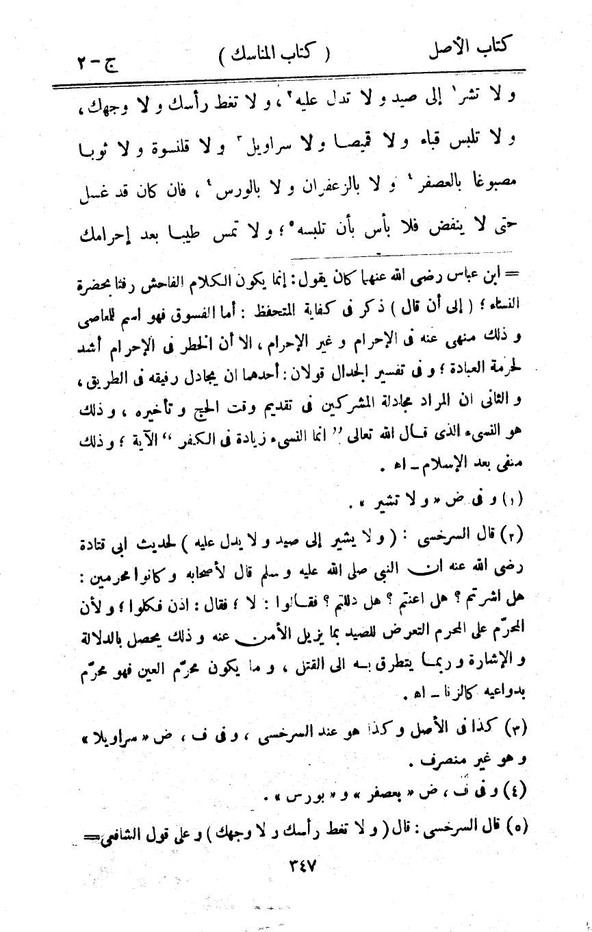 وَلَا تشر إِلَى صيد وَلَا تدل عَلَيْهِ وَلَا تغط رَأسك وَلَا وَجهك وَلَا تلبس قبَاء وَلَا قَمِيصًا وَلَا سَرَاوِيل وَلَا قلنسوة وَلَا ثوبا مصبوغا بالعصفر وَلَا بالزعفران وَلَا بالورس فَإِن كَانَ قد غسل حَتَّى لَا ينفض فَلَا بَأْس بِأَن تلبسه وَلَا تمس طيبا بعد إحرامك