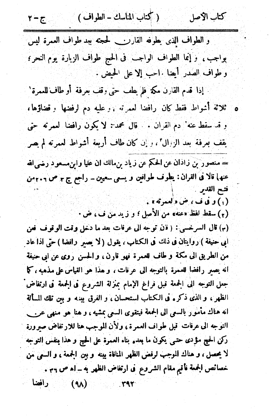 إِذا قدم الْقَارِن مَكَّة فَلم يطف حَتَّى وقف بِعَرَفَة أَو طَاف للْعُمْرَة ثَلَاثَة أَشْوَاط فَقَط كَانَ رافضا لعمرته وَعَلِيهِ دم لرفضها وقضاؤها وَقد سقط عَنهُ دم الْقرَان قَالَ مُحَمَّد لَا يكون رافضا لعمرته حَتَّى يقف بِعَرَفَة بعد الزَّوَال وَإِن كَانَ طَاف أَرْبَعَة أَشْوَاط لعمرته لم يصر