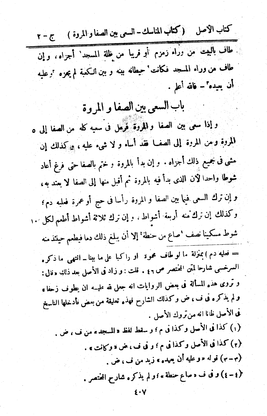 وَإِذا سعى بَين الصَّفَا والمروة فَرمَلَ فِي سَعْيه كُله من الصَّفَا إِلَى الْمَرْوَة وَمن الْمَرْوَة إِلَى الصَّفَا فقد أَسَاءَ وَلَا شَيْء عَلَيْهِ وَكَذَلِكَ إِن مشي فِي جَمِيع ذَلِك أجزاه وَإِن بَدَأَ بالمروة وَختم بالصفا حَتَّى فرغ أعَاد شوطا وَاحِدًا لِأَن الَّذِي بَدَأَ فِيهِ بالمروة ثمَّ أقبل مِنْهَا إِلَى الصَّفَا لَا يعْتد بِهِ وَإِن ترك السَّعْي فِيمَا بَين الصَّفَا والمروة رَأْسا فِي حج أَو عمْرَة فَعَلَيهِ دم وَكَذَلِكَ إِن ترك مِنْهُ أَرْبَعَة أَشْوَاط وَإِن ترك ثَلَاثَة أَشْوَاط أطْعم لكل شوط مِسْكينا نصف صَاع من حِنْطَة إِلَّا أَن يبلغ ذَلِك دَمًا فيطعم حِينَئِذٍ مِنْهُ