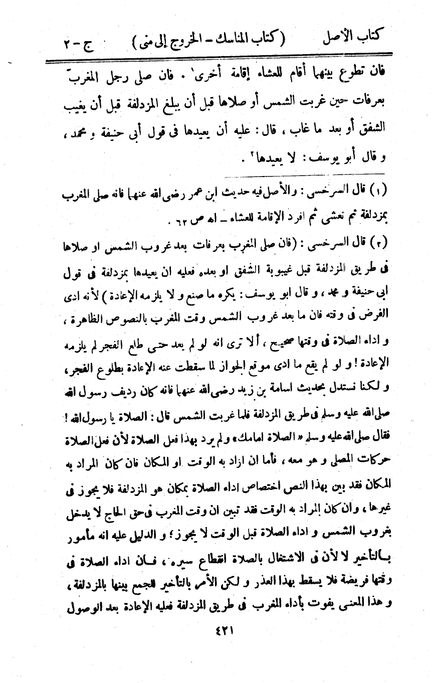 فان تطوع بَينهمَا أَقَامَ للعشاء إِقَامَة أُخْرَى فَإِن صلى رجل الْمغرب بِعَرَفَات حِين غربت الشَّمْس أَو صلاهَا قبل أَن يبلغ الْمزْدَلِفَة قبل أَن يغيب الشَّفق أَو بعد مَا غَابَ قَالَ عَلَيْهِ أَن يُعِيدهَا فِي قَول أبي حنيفَة وَمُحَمّد وَقَالَ أَبُو يُوسُف لَا يُعِيدهَا