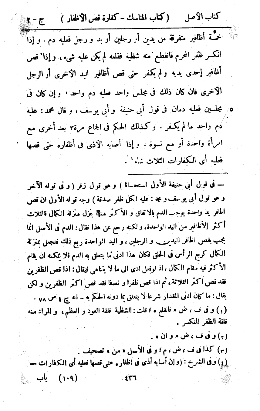 خَمْسَة أظافير مُتَفَرِّقَة من يدين أَو رجلَيْنِ أَو يَد وَرجل فَعَلَيهِ دم وَإِذا انْكَسَرَ ظفر الْمحرم فَانْقَطع مِنْهُ شظية فقلعه لم يكن عَلَيْهِ شَيْء وَإِذا قصّ أظافير إِحْدَى يَدَيْهِ وَلم يكفر حَتَّى قصّ أظافير الْيَد الْأُخْرَى أَو الرجل الْأُخْرَى فَإِن كَانَ ذَلِك فِي مجْلِس وَاحِد فَعَلَيهِ دم وَاحِد وَإِن كَانَ فِي مجلسين فَعَلَيهِ دمان فِي قَول أبي حنيفَة وَأبي يُوسُف وَقَالَ مُحَمَّد عَلَيْهِ دم وَاحِد مَا لم يكفر وَكَذَلِكَ الحكم فِي الْجِمَاع مرّة بعد أُخْرَى مَعَ امْرَأَة وَاحِدَة أَو مَعَ نسْوَة وَإِذا أَصَابَهُ الْأَذَى فِي أَظْفَاره حَتَّى قصها فَعَلَيهِ أَي الْكَفَّارَات الثَّلَاث شَاءَ