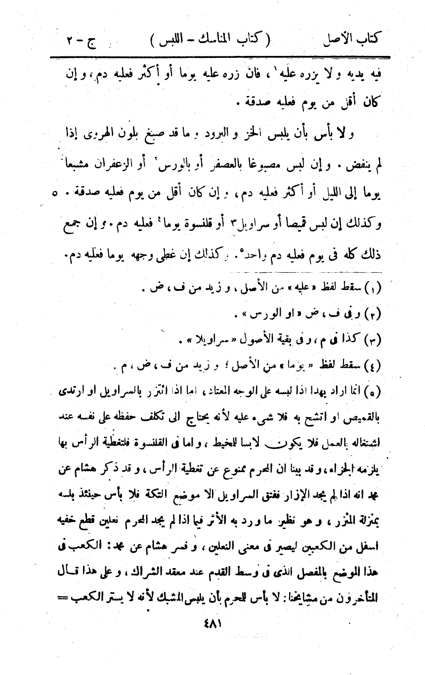 وَلَا بَأْس بِأَن يلبس الْخَزّ والبرود وَمَا قد صبغ بلون الهروى إِذا لم ينفض وَإِن لبس مصبوغا بالعصفر أَو بالورس أَو الزَّعْفَرَان مشبعا يَوْمًا إِلَى اللَّيْل أَو أَكثر فَعَلَيهِ دم وَإِن كَانَ أقل من يَوْم فَعَلَيهِ صَدَقَة وَكَذَلِكَ إِن لبس قَمِيصًا أَو سَرَاوِيل أَو قلنسوة يَوْمًا فَعَلَيهِ دم وَإِن جمع ذَلِك كُله فِي يَوْم فَعَلَيهِ دم وَاحِد وَكَذَلِكَ إِن غطى وَجهه يَوْمًا فَعَلَيهِ دم
