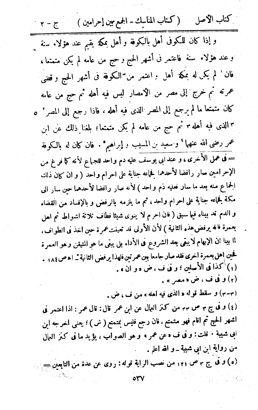 وَإِذا كَانَ للكوفي أهل بِالْكُوفَةِ وَأهل بِمَكَّة يُقيم عِنْد هَؤُلَاءِ سنة وَعند هَؤُلَاءِ سنة فَاعْتَمَرَ فِي أشهر الْحَج وَحج من عَامه لم يكن مُتَمَتِّعا فَإِن لم يكن لَهُ بِمَكَّة أهل وَاعْتمر من الْكُوفَة فِي أشهر الْحَج وَقضى عمرته ثمَّ خرج إِلَى مصر من الْأَمْصَار لَيْسَ فِيهِ أَهله ثمَّ حج من عَامه كَانَ مُتَمَتِّعا مَا لم يرجع إِلَى الْمصر الَّذِي فِيهِ أَهله فَإِذا رَجَعَ إِلَى الْمصر الَّذِي فِيهِ أَهله ثمَّ حج من عَامه لم يكن مُتَمَتِّعا بلغنَا ذَلِك عَن ابْن عمر رَضِي الله عَنْهُمَا وَسَعِيد بن الْمسيب وَإِبْرَاهِيم فَإِن كَانَ لَهُ بِالْكُوفَةِ