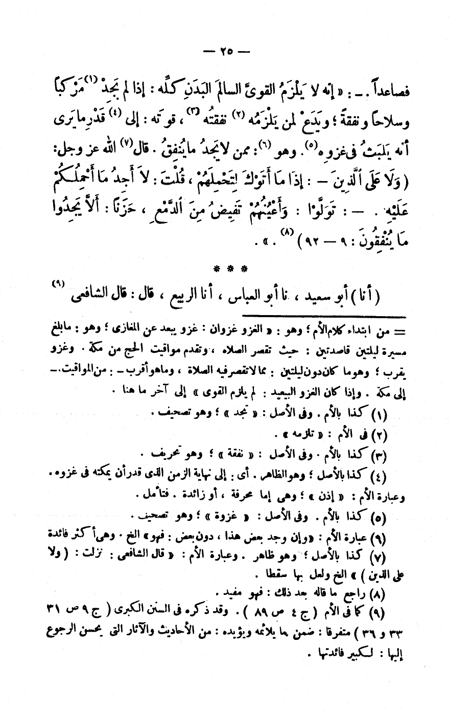 (9) كَمَا فى الْأُم (ج 4 ص 89) . وَقد ذكره فى السّنَن الْكُبْرَى (ج 9 ص 31 33 و36) مُتَفَرقًا: ضمن مَا يلائمه وَيُؤَيِّدهُ: من الْأَحَادِيث والْآثَار الَّتِي يحسن الرُّجُوع إِلَيْهَا: لكبير فائدتها.