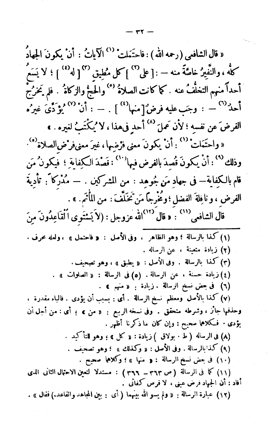 (14) كَمَا فى الرسَالَة (ص 363- 366) : مستدلا لتعين الِاحْتِمَال الثَّانِي الَّذِي أَفَادَ: أَن الْجِهَاد فرض عينى، لَا فرض كفائى.