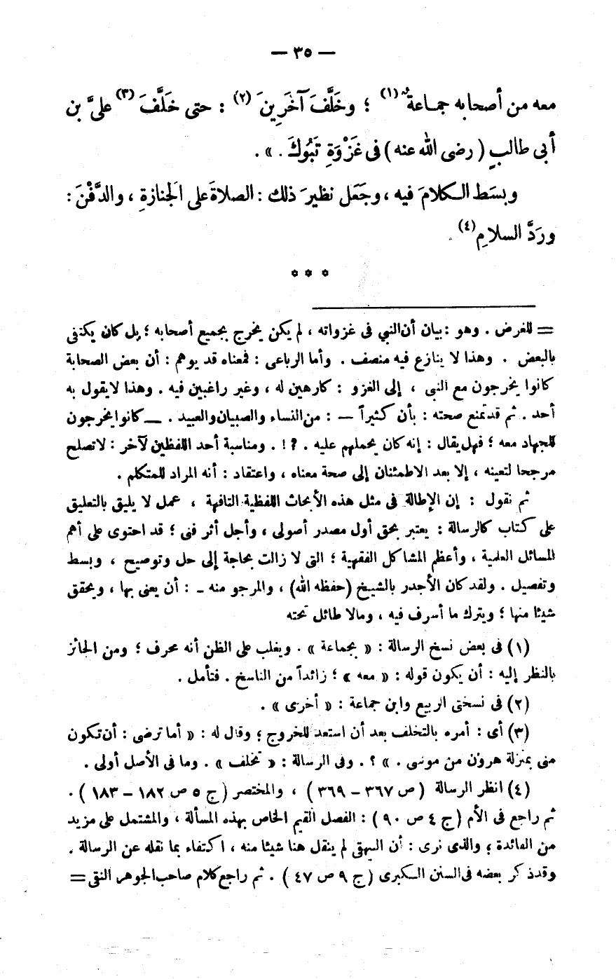 (3) أَي: أمره بالتخلف بعد أَن استعد لِلْخُرُوجِ وَقَالَ لَهُ: «أما ترْضى: أَن تكون منى بِمَنْزِلَة هرون من مُوسَى.» ؟. وفى الرسَالَة: «تخلف» . وَمَا فى الأَصْل أولى.