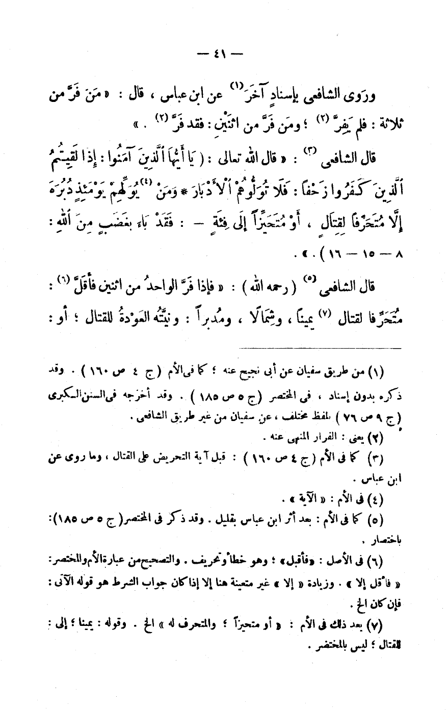 قَالَ الشَّافِعِيُّ «3» : «قَالَ اللَّهُ تَعَالَى: (يَا أَيُّهَا الَّذِينَ آمَنُوا: إِذا لَقِيتُمُ الَّذِينَ كَفَرُوا زَحْفاً: فَلا تُوَلُّوهُمُ الْأَدْبارَ وَمَنْ «4» يُوَلِّهِمْ يَوْمَئِذٍ دُبُرَهُ إِلَّا مُتَحَرِّفاً لِقِتالٍ، أَوْ مُتَحَيِّزاً إِلى فِئَةٍ-: فَقَدْ باءَ بِغَضَبٍ مِنَ اللَّهِ: 8- 15- 16) .» .