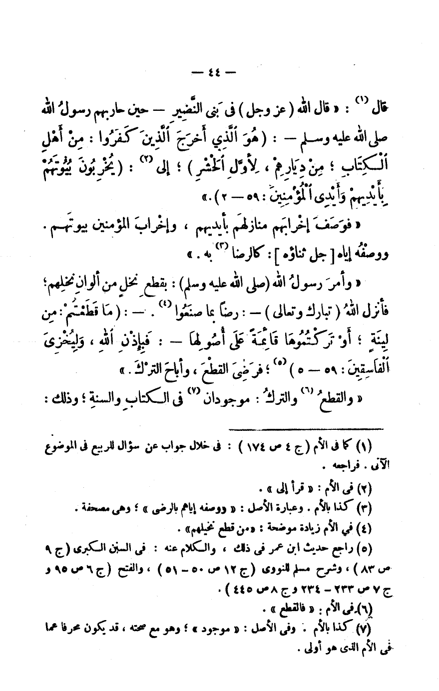 «وَأَمَرَ رَسُولُ اللَّهِ (صَلَّى اللهُ عَلَيْهِ وَسَلَّمَ) : بِقَطْعِ نَخْلٍ مِنْ أَلْوَانِ نَخْلِهِمْ فَأَنْزَلَ اللَّهُ (تَبَارَكَ وَتَعَالَى) -: رِضًا بِمَا صَنَعُوا «4» .-: (مَا قَطَعْتُمْ: مِنْ لِينَةٍ أَوْ تَرَكْتُمُوها قائِمَةً عَلى أُصُولِها-: فَبِإِذْنِ اللَّهِ، وَلِيُخْزِيَ الْفاسِقِينَ: 59- 5) «5» فَرَضِيَ الْقَطْعَ، وَأَبَاحَ التَّرْكَ.»