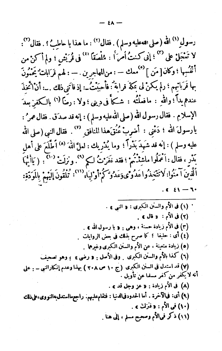 لَا تَعْجَلْ عَلَيَّ «4» إنِّي كُنْتُ امْرَأً: مُلْصَقًا «5» فِي قُرَيْشٍ وَلَمْ أَكُنْ مِنْ أَنْفُسِهَا وَكَانَ [مَنْ] «6» مَعَكَ-: مِنْ الْمُهَاجِرِينَ.-: لَهُمْ قَرَابَاتٌ يَحْمُونَ بِهَا قِرْبَاتِهِمْ وَلَمْ يَكُنْ لِي بِمَكَّةَ قَرَابَةٌ: فَأَحْبَبْتُ-: إذْ فَاتَنِي ذَلِكَ.-: أَنْ أَتَّخِذَ عِنْدَهُمْ يَدًا وَاَللَّهِ: مَا فَعَلْتُهُ: شَكًّا فِي دِينِي وَلَا: رِضًا «7» بِالْكُفْرِ بَعْدَ الْإِسْلَامِ. فَقَالَ رَسُولُ اللَّهِ (صَلَّى اللهُ عَلَيْهِ وَسَلَّمَ) : إنَّهُ قَدْ صَدَقَ. فَقَالَ عُمَرُ: