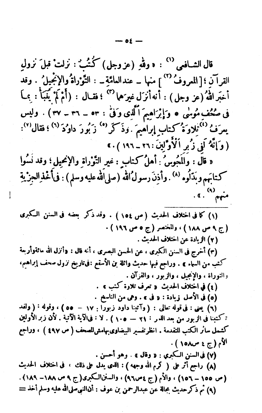 قَالَ الشَّافِعِيُّ «1» : «وَلِلَّهِ (عَزَّ وَجَلَّ) كُتُبٌ: نَزَلَتْ قَبْلَ نُزُولِ الْقُرْآنِ [الْمَعْرُوفُ «2» ] مِنْهَا- عِنْدَ الْعَامَّةِ-: التَّوْرَاةُ وَالْإِنْجِيلُ. وَقَدْ أَخْبَرَ اللَّهُ (عَزَّ وَجَلَّ) : أَنَّهُ أَنْزَلَ غَيْرَهُمَا «3» فَقَالَ: (أَمْ لَمْ يُنَبَّأْ: بِما فِي صُحُفِ مُوسى وَإِبْراهِيمَ الَّذِي وَفَّى: 53- 36- 37) . وَلَيْسَ يُعْرَفُ «4» تِلَاوَةُ كِتَابِ إبْرَاهِيمَ. وَذِكْرُ «5» زَبُورَ دَاوُد «6» فَقَالَ «7» :