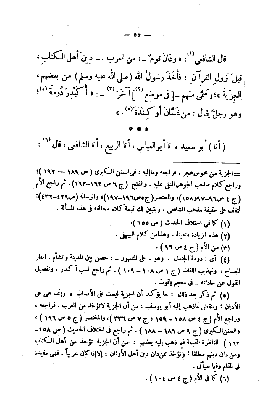 (5) ثمَّ ذكر بعد ذَلِك: مَا يُؤَكد أَن الْجِزْيَة لَيست على الْأَنْسَاب، وَإِنَّمَا هى على الْأَدْيَان وينقض مَا ذهب إِلَيْهِ أَبُو يُوسُف: من أَن الْجِزْيَة لَا تُؤْخَذ من الْعَرَب. فَرَاجعه، وراجع الْأُم (ج 4 ص 158- 159 وَج 7 ص 336) ، والمختصر (ج 5 ص 196) ، وَالسّنَن الْكُبْرَى (ج 9 ص 186- 188) . ثمَّ رَاجع فى اخْتِلَاف الحَدِيث (ص 158- 162) المناظرة الْقيمَة فِيمَا ذهب إِلَيْهِ بَعضهم: من أَن الْجِزْيَة تُؤْخَذ من أهل الْكتاب وَمن دَان دينهم مُطلقًا وَتُؤْخَذ مِمَّن دَان دين أهل الْأَوْثَان: إِلَّا إِذا كَانَ عَرَبيا. فهى مفيدة فى الْمقَام وَفِيمَا سيأتى.