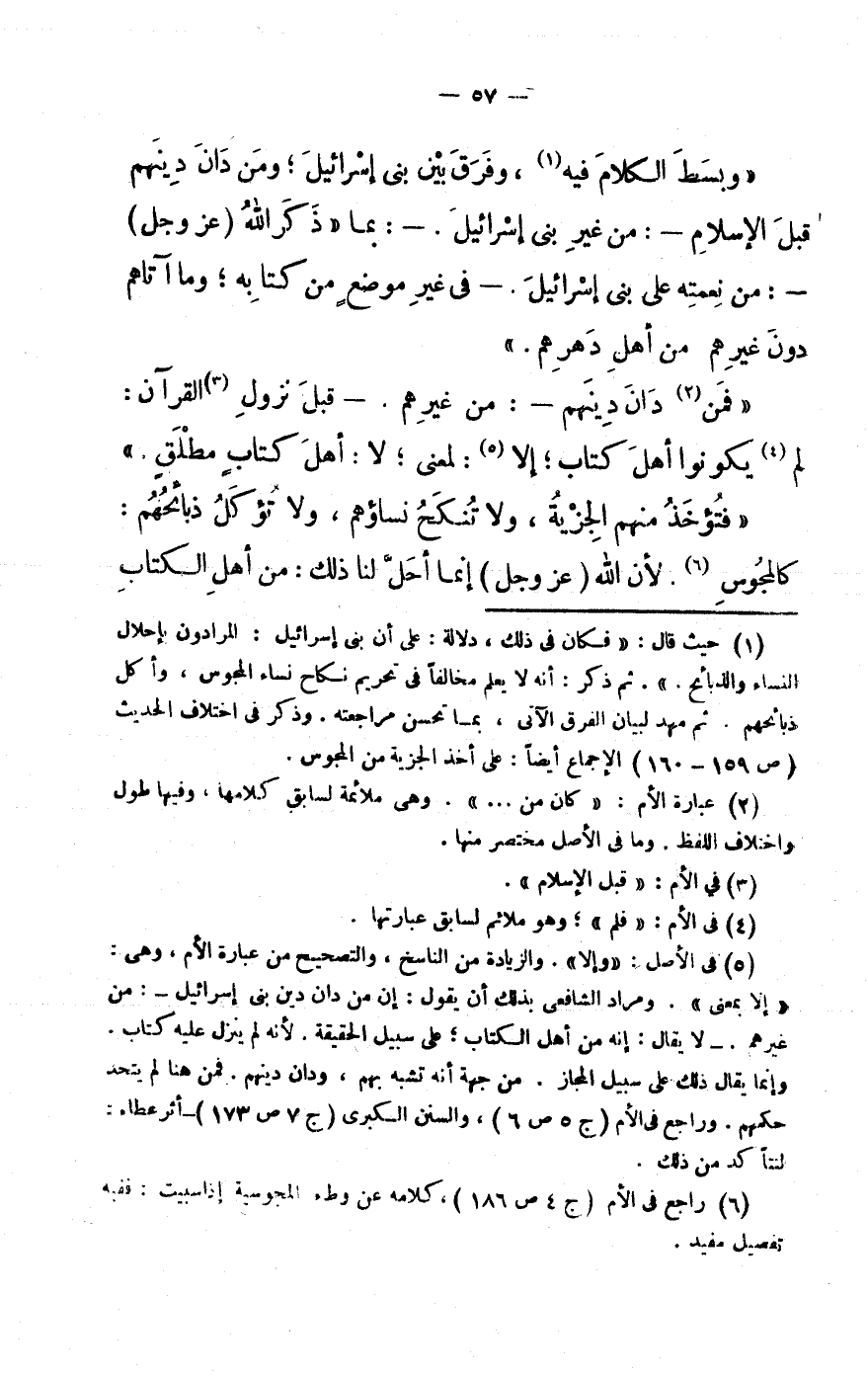 (1) حَيْثُ قَالَ: «فَكَانَ فى ذَلِك، دلَالَة: على أَن بنى إِسْرَائِيل: المرادون بإحلال النِّسَاء والذبائح.» . ثمَّ ذكر: أَنه لَا يعلم مُخَالفا فى تَحْرِيم نِكَاح نسَاء الْمَجُوس، وَأكل ذَبَائِحهم. ثمَّ مهد لبَيَان الْفرق الْآتِي، بِمَا تحسن مُرَاجعَته. وَذكر فى اخْتِلَاف الحَدِيث (ص 159- 160) الْإِجْمَاع أَيْضا: على أَخذ الْجِزْيَة من الْمَجُوس.