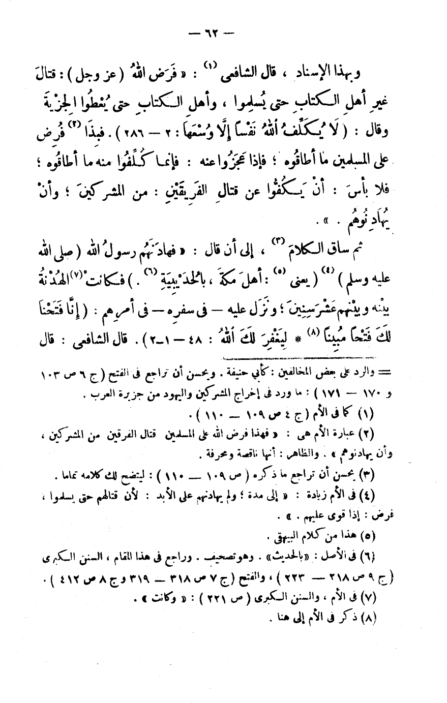 (2) عبارَة الْأُم هى: «فَهَذَا فرض الله على الْمُسلمين قتال الفرقين من الْمُشْركين، وَأَن يهادنوهم» . وَالظَّاهِر: أَنَّهَا نَاقِصَة ومحرفة.
