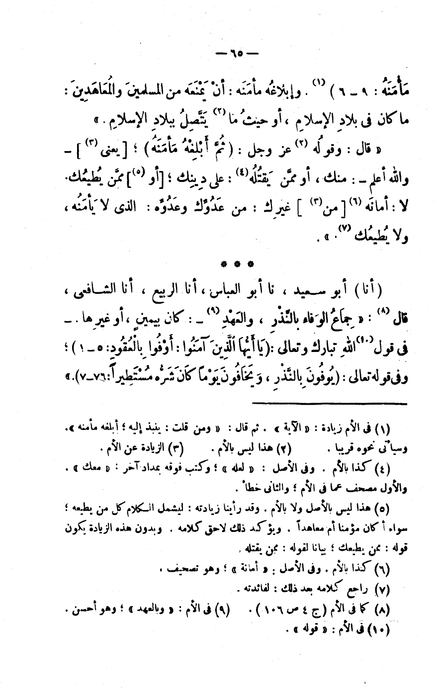 (6) هَذَا لَيْسَ بِالْأَصْلِ وَلَا بِالْأُمِّ. وَقد رَأينَا زِيَادَته: ليشْمل الْكَلَام كل من يطيعه سَوَاء أَكَانَ مُؤمنا أم معاهدا. ويؤكد ذَلِك لَا حق كَلَامه. وَبِدُون هَذِه الزِّيَادَة يكون قَوْله: مِمَّن يطيعك بَيَانا لقَوْله: مِمَّن يقْتله. [.....]