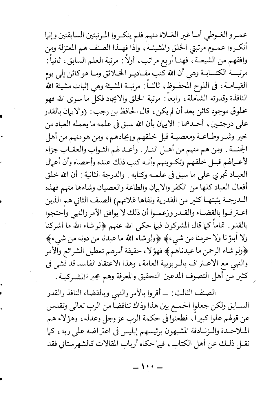 عمرو الغوطي أما غير الغلاة منهم فلم ينكروا المرتبتين السابقتين وإنما أنكروا عموم مرتبتي الخلق والمشيئة، وإذاً فهذا الصنف هم المعتزلة ومن وافقهم من الشيعة، فهنا أربع مراتب، أولا: مرتبة العلم السابق، ثانيا: مرتبة الكتابة وهي أن الله كتب مقادير الخلائق وما هوكائن إلى يوم القيامة فى اللوح المحفوظ، ثالثا: مرتبة المشيئة وهي إثبات مشيئة الله النافذة وقدرته الشاملة، رابعا: مرتبة الخلق والإيجاد فكل ما سوى الله فهو مخلوق موجود كائن بعد أن لم يكن، قال الحافظ بن رجب: "والإيمان بالقدر على درجتين، أحدهما: الإيمان بأن الله سبق فى علمه ما يعمله العباد من خير وشر وطاعة ومعصية قبل خلقهم وإيجادهم، ومن هومنهم من أهل الجنة، ومن هم منهم من أهل النار، وأعد لهم الثواب والعقاب جزاء لأعمالهم قبل خلقهم وتكوينهم وأنه كتب ذلك عنده وأحصاه وأن أعمال العباد تجري على ما سبق في علمه وكتابه. والدرجة الثانية: أن الله خلق أفعال العباد كلها من الكفر والإيمان والطاعة والعصيان وشاءها منهم فهذه الدرجة يثبتها كثير من القدرية ونفاها غلاتهم، الصنف الثاني: هم الذين اعترفوا بالقضاء والقدر وزعموا أن ذلك لا يوافق الأمر والنهي واحتجوا بالقدر تماما كما قال المشركون فيما حكى الله عنهم {سَيَقُولُ الَّذِينَ أَشْرَكُوا لَوْ شَاءَ اللَّهُ مَا أَشْرَكْنَا وَلا آبَاؤُنَا وَلا حَرَّمْنَا مِنْ شَيْءٍ} ، {لَوْ شَاءَ اللَّهُ مَا عَبَدْنَا مِنْ دُونِهِ مِنْ شَيْءٍ} ، {لَوْ شَاءَ الرَّحْمَنُ مَا عَبَدْنَاهُمْ} ، فهؤلاء حقيقة أمرهم تعطيل الشرائع والأمر والنهي مع الاعتراف بالربوبية العامة، وهذا الاعتقاد الفاسد قد فشى في كثير من أهل التصوف المدعين التحقيق والمعرفة وهم مجبرة المشركية.