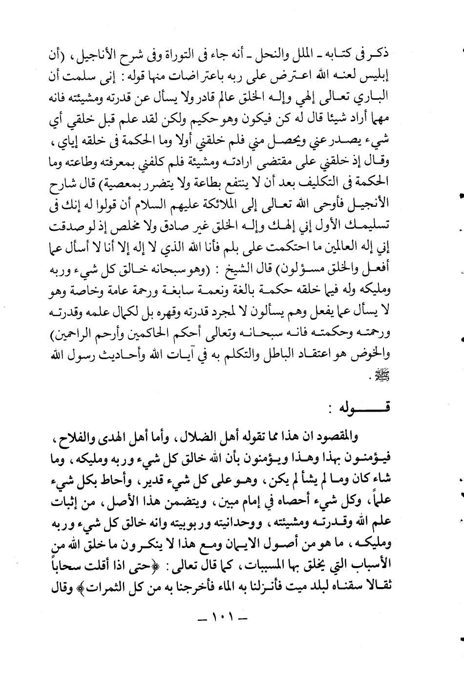 ذكر في كتابه (الملل والنحل) أنه جاء في التوراة وفي شرح الأناجيل: "أن إبليس لعنه الله اعترض على ربه باعتراضات منها قوله: إني سلمت أن الباري تعالى إلهي وإله الخلق عالم قادر ولا يسأل عن قدرته ومشيئته فإنه مهما أراد شيئا قال له كن فيكون وهو حكيم ولكن لقد علم قبل خلقي أي شيء يصدر عني ويحصل مني فلم خلقني أولا وما الحكمة في خلقه إياي، وقال: إذ خلقني على مقتضى إرادته ومشيئة فلم كلفني بمعرفته وطاعته وما الحكمة في التكليف بعد أن لا ينتفع بطاعة ولا يتضرر بمعصية"، قال شارح الإنجيل: "فأوحى الله تعالى إلى الملائكة عليهم السلام أن قولوا له إنك في تسليمك الأول أني إلهك وإله الخلق غير صادق ولا مخلص إذ لو صدقت أني إله العالمين ما احتكمت علي بـ (لم) ، فأنا الله الذي لا إله إلا أنا لا أسأل عما أفعل والخلق مسؤولون"، قال الشيخ: "وهوسبحانه خالق كل شيء وربه ومليكه وله فيما خلقه حكمة بالغة ونعمة سابغة ورحمة عامة وخاصة وهو لا يسأل عما يفعل وهم يسألون لا لمجرد قدرته وقهره بل لكمال علمه وقدرته ورحمته وحكمته فإنه سبحانه وتعالى أحكم الحاكمين وأرحم الراحمين" والخوض: هو اعتقاد الباطل والتكلم به في آيات الله وأحاديث رسول الله صلى الله عليه وسلم.