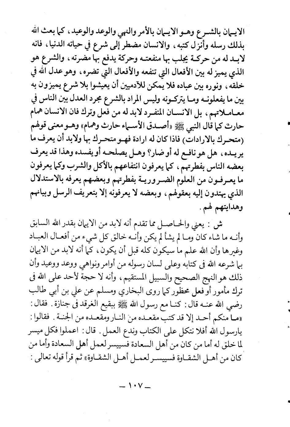ش: يعني والحاصل مما تقدم أنه لابد من الإيمان بقدر الله السابق وأنه ما شاء كان وما لم يشأ لم يكن وأنه خالق كل شيء من أفعال العباد وغيرها وأن الله علم ما سيكون كله قبل أن يكون، كما أنه لابد من الإيمان بما شرعه الله في كتابه وعلى لسان رسوله من أوامر ونواهي ووعد ووعيد وأن ذلك هو النهج الصحيح والسبيل المستقيم، وأنه لا حجة لأحد على الله في ترك مأمور أو فعل محظور، كما روى البخاري ومسلم عن علي بن أبي طالب رضي الله عنه قال: "كنا مع رسول الله صلى الله عليه وسلم ببقيع الغرقد في جنازة فقالت: "ما منكم أحد إلا قد كتب مقعده من النار ومقعده من الجنة. فقالوا: يا رسول لله أفلا نتكل على الكتاب وندع العمل؟، قال: اعملوا فكل ميسر لما خلق له، أما من كان من أهل السعادة فسييسر لعمل أهل السعادة وأما من كان من أهل الشقاوة فسييسر لعمل أهل الشقاوة" ثم قرأ قوله تعالى: