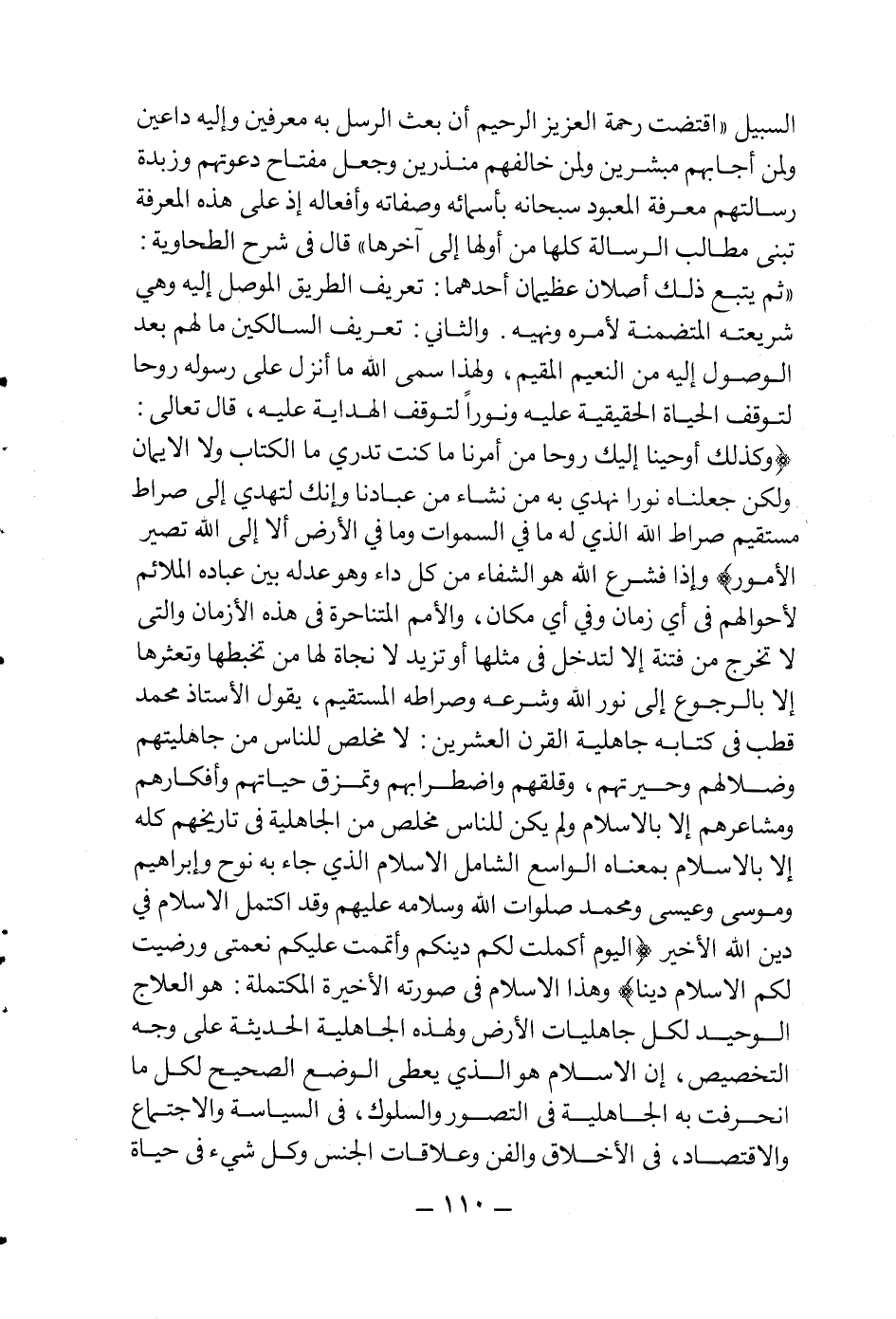 السبيل: "اقتضت رحمة العزيز الرحيم أن بعث الرسل به معرفين وإليه داعين ولمن أجابهم مبشرين ولمن خالفهم منذرين وجعل مفتاح دعوتهم وزبدة رسالتهم معرفة المعبود سبحانه بأسمائه وصفاته وأفعاله إذ على هذه المعرفة تبنى مطالب الرسالة كلها من أولها إلى آخرها" قال في شرح الطحاوية: "ثم يتبع ذلك أصلان عظيمان أحدهما: تعريف الطريق الموصل إليه وهي شريعته المتضمنة لأمره ونهيه. والثاني: تعريف السالكين ما لهم بعد الوصول إليه من النعيم المقيم، ولهذا سمى الله ما أنزل على رسوله روحا لتوقف الحياة الحقيقية عليه ونورا لتوقف الهداية عليه، قال تعالى: {وَكَذَلِكَ أَوْحَيْنَا إِلَيْكَ رُوحاً مِنْ أَمْرِنَا مَا كُنْتَ تَدْرِي مَا الْكِتَابُ وَلا الإِيمَانُ وَلَكِنْ جَعَلْنَاهُ نُوراً نَهْدِي بِهِ مَنْ نَشَاءُ مِنْ عِبَادِنَا وَإِنَّكَ لَتَهْدِي إِلَى صِرَاطٍ مُسْتَقِيمٍ، صِرَاطِ اللَّهِ الَّذِي لَهُ مَا فِي السَّمَاوَاتِ وَمَا فِي الأَرْضِ أَلا إِلَى اللَّهِ تَصِيرُ الأُمُورُ} ، وإذا فشرع الله هو الشفاء من كل داء وهو عدله بين عباده الملائم لأحوالهم في أي زمان وفي أي مكان، والأمم المتناحرة في هذه الأزمان والتي لا تخرج من فتنة إلا لتدخل في مثلها أو تزيد لا نجاة لها من تخبطها وتعثرها إلا بالرجوع إلى نور الله وشرعه وصراطه المستقيم، يقول الأستاذ محمد قطب في كتابه جاهلية القرن العشرين: "لا مخلص للناس من جاهليتهم وضلالهم وحيرتهم، وقلقهم واضطرابهم وتمزق حياتهم وأفكارهم ومشاعرهم إلا بالإسلام ولم يكن للناس مخلص من الجاهلية في تاريخهم كله إلا بالإسلام بمعناه الواسع الشامل الإسلام الذي جاء به نوح وإبراهيم وموسى وعيسى ومحمد صلوات الله وسلامه عليهم وقد اكتمل الإسلام في دين الله الأخير: {الْيَوْمَ أَكْمَلْتُ لَكُمْ دِينَكُمْ وَأَتْمَمْتُ عَلَيْكُمْ نِعْمَتِي وَرَضِيتُ لَكُمُ الإِسْلامَ دِينا} ، وهذا الإسلام في صورته الأخيرة المكتملة: هو العلاج الوحيد لكل جاهليات الأرض ولهذه الجاهلية الحديثة على وجه التخصيص، إن الإسلام هو الذي يعطي الوضع الصحيح لكل ما انحرفت به الجاهلية في التصور والسلوك، في السياسة والاجتماع والاقتصاد، في الأخلاق والفن وعلاقات الجنس وكل شيء في حياة