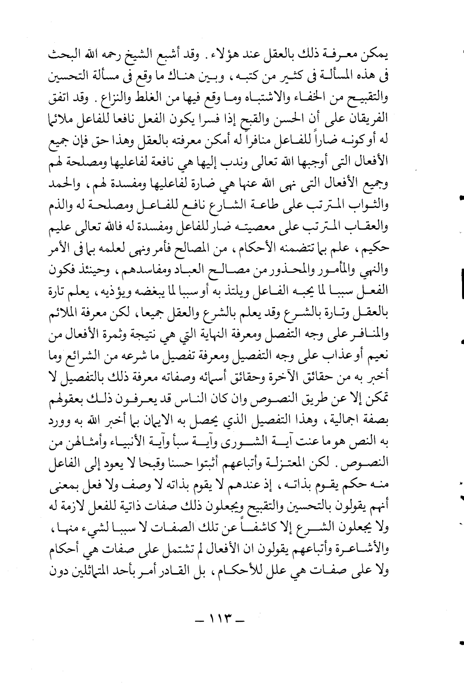 يمكن معرفة ذلك بالعقل عند هؤلاء. وقد أشبع الشيخ رحمه لله البحث في هذه المسألة في كثير من كتبه، وبين هناك ما وقع في مسألة التحسين والتقبيح من الخفاء والاشتباه وما وقع فيها من الغلط والنزاع. وقد اتفق الفريقان على أن الحسن والقبح إذا فسرا بكون الفعل نافعا للفاعل ملائما له أو كونه ضارا للفاعل منافرا له أمكن معرفته بالعقل، وهذا حق فإن جميع الأفعال التي أوجبها الله تعالى وندب إليها هي نافعة لفاعليها ومصلحة لهم، وجميع الأفعال التي نهى الله عنها هي ضارة لفاعليها ومفسدة لهم، والحمد والثواب المترتب على طاعة الشارع نافع للفاعل ومصلحة له والذم والعقاب المترتب على معصيته ضار للفاعل ومفسدة له، فالله تعالى عليم حكيم علم بما تتضمنه الأحكام من المصالح فأمر ونهى لعلمه بما في الأمر والنهي والمأمور والمحذور من مصالح العباد ومفاسدهم، وحينئذ فكون الفعل سببا لما يحبه الفاعل ويلتذ به أو سببا لما يبغضه ويؤذيه يُعلم تارة بالعقل وتارة بالشرع وقد يعلم بالشرع والعقل جميعا، لكن معرفة الملائم والمنافر على وجه التفصيل ومعرفة النهاية التي هي نتيجة وثمرة الأفعال من نعيم أو عذاب على وجه التفصيل ومعرفة تفصيل ما شرعه من الشرائع وما أخبر به من حقائق الآخرة وحقائق أسمائه وصفاته معرفة ذلك بالتفصيل لا تمكن إلا عن طريق النصوص وإن كان الناس قد يعرفون ذلك بعقولهم بصفة إجمالية، وهذا التفصيل الذي يحصل به الإيمان بما خبر الله به وورد به النص هو ما عنت آية الشورى وآية سبأ وآية الأنبياء وأمثالهن من النصوص. لكن المعتزلة وأتباعهم أثبتوا حسنا وقبحا لا يعود إلى الفاعل منه حكم يقوم بذاته، إذ عندهم لا يقوم بذاته لا وصف ولا فعل بمعنى أنهم يقولون بالتحسين والتقبيح ويجعلون ذلك صفات ذاتية للفعل لازمة له ولا يجعلون الشرع إلا كاشفا عن تلك الصفات لا سببا لشيء منها، والأشاعرة وأتباعهم يقولون إن الأفعال لم تشتمل على صفات هي أحكام ولا على صفات هي علل للأحكام، بل القادر أمر بأحد المتماثلين دون