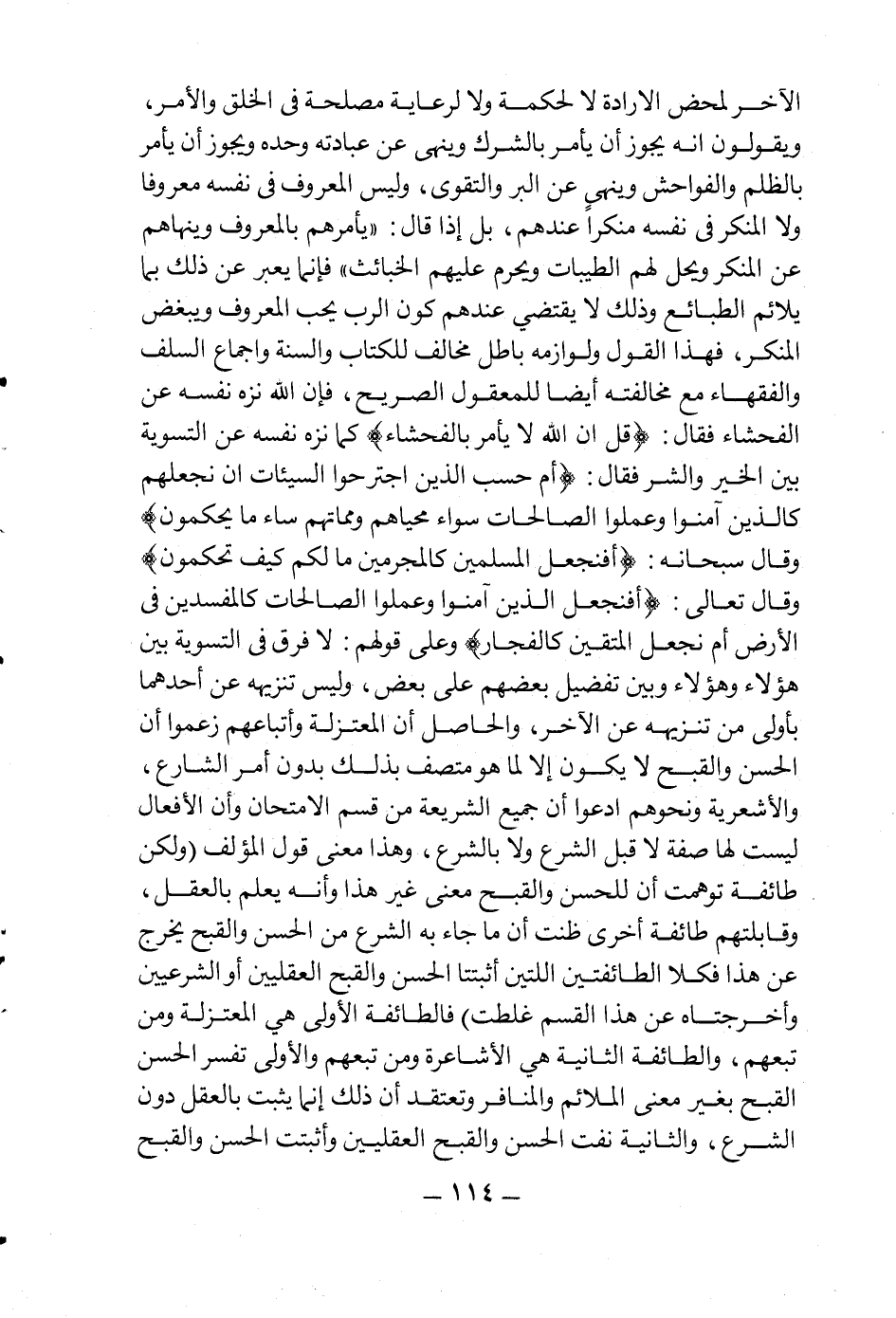 الآخر لمحض الإرادة لا لحكمة ولا لرعاية مصلحة في الخلق والأمر، ويقولون إنه يجوز أن يأمر بالشرك وينهى عن عبادته وحده ويجوز أن يأمر بالظلم والفواحش وينهى عن البر والتقوى، وليس المعروف في نفسه معروفا ولا المنكر في نفسه منكرا عندهم، بل إذا قال: {يَأْمُرُهُمْ بِالْمَعْرُوفِ وَيَنْهَاهُمْ عَنِ الْمُنْكَرِ وَيُحِلُّ لَهُمُ الطَّيِّبَاتِ وَيُحَرِّمُ عَلَيْهِمُ الْخَبَائِثَ} فإنما يعبر عن ذلك بما يلائم الطبائع وذلك لا يقتضي عندهم كون الرب يحب المعروف ويبغض المنكر، فهذا القول ولوازمه باطل مخالف للكتاب والسنة وإجماع السلف والفقهاء مع مخالفته أيضا للمعقول الصريح، فإن الله نزه نفسه عن الفحشاء فقال: {قُلْ إِنَّ اللَّهَ لا يَأْمُرُ بِالْفَحْشَاءِ} ، كما نزه نفسه عن التسوية بين الخير والشر فقال: {أَمْ حَسِبَ الَّذِينَ اجْتَرَحُوا السَّيِّئَاتِ أَنْ نَجْعَلَهُمْ كَالَّذِينَ آمَنُوا وَعَمِلُوا الصَّالِحَاتِ سَوَاءً مَحْيَاهُمْ وَمَمَاتُهُمْ سَاءَ مَا يَحْكُمُونَ} ، وقال سبحانه: {أَفَنَجْعَلُ الْمُسْلِمِينَ كَالْمُجْرِمِينَ مَا لَكُمْ كَيْفَ تَحْكُمُونَ} ، وقال تعالى: {أَمْ نَجْعَلُ الَّذِينَ آمَنُوا وَعَمِلُوا الصَّالِحَاتِ كَالْمُفْسِدِينَ فِي الْأَرْضِ أَمْ نَجْعَلُ الْمُتَّقِينَ كَالْفُجَّارِ} ، وعلى قولهم: لا فرق في التسوية بين هؤلاء وهؤلاء وبين تفضيل بعضهم على بعض، وليس تنزيهه عن أحدهما بأولى من تنزيهه عن الآخر، والحاصل أن المعتزلة وأتباعهم زعموا أن الحسن والقبح لا يكون إلا لما هو متصف بذلك بدون أمر الشارع، والأشعرية ونحوهم ادعوا أن جميع الشريعة من قسم الامتحان وأن الأفعال ليست لها صفة لا قبل الشرع ولا بالشرع، وهذا معنى قول المؤلف: "ولكن طائفة توهمت أن للحسن والقبح معنى غير هذا وأنه يعلم بالعقل، وقابلتهم طائفة أخرى ظنت أن ما جاء به الشرع من الحسن والقبح يخرج عن هذا فكلا الطائفتين اللتين أثبتتا الحسن والقبح العقليين أوالشرعيين وأخرجتاه عن هذا القسم غلطت"، فالطائفة الأولى هي المعتزلة ومن تبعهم، والطائفة الثانية هي الأشاعرة ومن تبعهم والأولى تفسر الحسن القبح بغير معنى الملائم والمنافر وتعتقد أن ذلك إنما يثبت بالعقل دون الشرع، والثانية نفت الحسن والقبح العقليين وأثبتت الحسن والقبح
