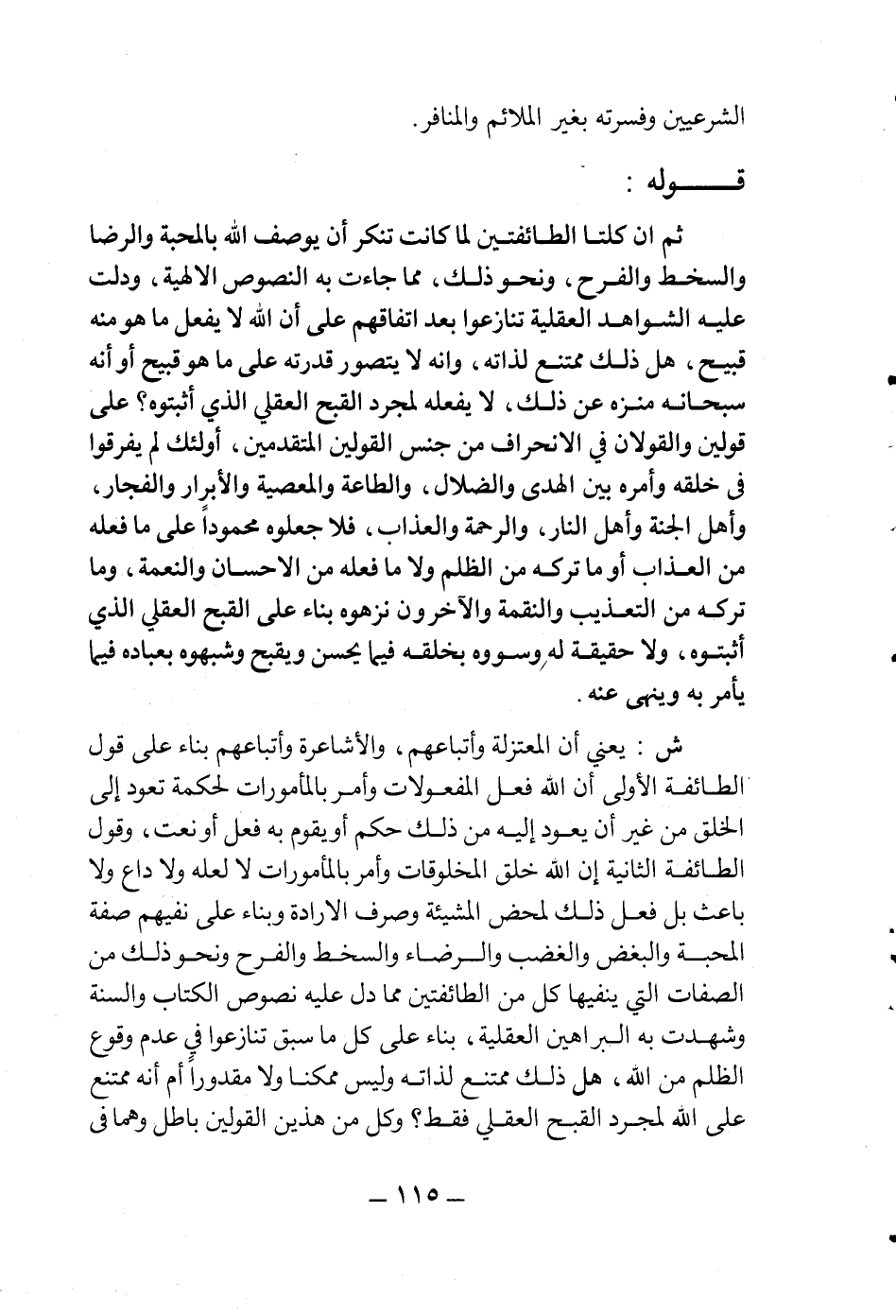 ش: يعني أن المعتزلة وأتباعهم، والأشاعرة وأتباعهم بناء على قول الطائفة الأولى أن الله فعل المفعولات وأمر بالمأمورات لحكمة تعود إلى الخلق من غير أن يعود إليه من ذلك حكم أو يقوم به فعل أو نعت، وقول الطائفة الثانية أن الله خلق المخلوقات وأمر بالمأمورات لا لعلة ولا داع ولا باعث بل فعل ذلك لمحض المشيئة وصرف الإرادة وبناء على نفيهم صفة المحبة والبغض والغضب والرضاء والسخط والفرح ونحو ذلك من الصفات التي ينفيها كل من الطائفتين مما دل عليه نصوص الكتاب والسنة وشهدت به البراهين العقلية، بناء على كل ما سبق تنازعوا في عدم وقوع الظلم من الله، هل ذلك ممتنع لذاته وليس ممكنا ولا مقدورا أم أنه ممتنع على الله لمجرد القبح العقلي فقط؟، وكل من هذين القولين باطل وهما في