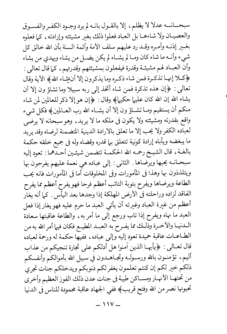 سبحانه عدلا لا يظلم إلا بالقول بأنه لم يرد وجود الكفر والفسوق والعصيان ولا شاءها بل العباد فعلوا ذلك بغير مشيئته وإرادته، كما فعلوه بغير إذنه وأمره وقد رد عليهم سلف الأمة وأئمة السنة بأن الله خالق كل شيء وأنه ماشاء كان وما لم يشأ لم يكن، يضل من يشاء ويهدي من يشاء وأن العباد لهم مشيئة وقدرة فيفعلون بمشيئتهم وقدرتهم، كما قال تعالى: {كَلاَّ إِنَّهُ تَذْكِرَةٌ، فَمَنْ شَاءَ ذَكَرَهُ، وَمَا يَذْكُرُونَ إِلَّا أَنْ يَشَاءَ اللَّهُ ... الآية} ، وقال تعالى: {إِنَّ هَذِهِ تَذْكِرَةٌ فَمَنْ شَاءَ اتَّخَذَ إِلَى رَبِّهِ سَبِيلاً وَمَا تَشَاءُونَ إِلَّا أَنْ يَشَاءَ اللَّهُ إِنَّ اللَّهَ كَانَ عَلِيماً حَكِيماً} ، وقال: {إِنْ هُوَ إِلاَّ ذِكْرٌ لِلْعَالَمِينَ، لِمَنْ شَاءَ مِنْكُمْ أَنْ يَسْتَقِيمَ وَمَا تَشَاءُونَ إِلَّا أَنْ يَشَاءَ اللَّهُ رَبُّ الْعَالَمِينَ} ، فكل شيء واقع بقدرته ومشيئته ولا يكون في ملكه ما لا يريد، وهو سبحانه لا يرضى لعباده الكفر ولا يحب إلا ما تعلق بالإرادة الدينية المتضمنة لرضاه وقد يريد ما يبغضه ويأباه إرادة كونية تتعلق بما قدره وقضاه وله في جميع خلقه حكمة بالغة، قال الشيخ رحمه الله: الحكمة تتضمن شيئين أحدهما: تعود إليه سبحانه يحبها ويرضاها. الثاني: إلى عباده هي نعمة عليهم يفرحون بها ويتلذذون بها وهذا في المأمورات وفى المخلوقات أما في المأمورات فإنه يحب الطاعة ويرضاها ويفرح بتوبة التائب أعظم فرح، فهو يفرح أعظم مما يفرح الفاقد لزاده وراحلته في الأرض المهلكة إذا وجدها بعد اليأس. كما أنه يغار أعظم من غيرة العباد، وغيرته أن يأتي العبد ما حرم عليه فهو يغار إذا فعل العبد ما نهاه ويفرح إذا تاب ورجع إلى ما أمر به، والطاعة عاقبتها سعادة الدنيا والآخرة وذلك مما يفرح به العبد المطيع فكان فيما أمر الله به من الطاعات عاقبة حميدة تعود إليه وإلى عباده، ففيها حكمة له ورحمة لعباده قال تعالى: {يَا أَيُّهَا الَّذِينَ آمَنُوا هَلْ أَدُلُّكُمْ عَلَى تِجَارَةٍ تُنْجِيكُمْ مِنْ عَذَابٍ أَلِيمٍ، تُؤْمِنُونَ بِاللَّهِ وَرَسُولِهِ وَتُجَاهِدُونَ فِي سَبِيلِ اللَّهِ بِأَمْوَالِكُمْ وَأَنْفُسِكُمْ ذَلِكُمْ خَيْرٌ لَكُمْ إِنْ كُنْتُمْ تَعْلَمُونَ، يَغْفِرْ لَكُمْ ذُنُوبَكُمْ وَيُدْخِلْكُمْ جَنَّاتٍ تَجْرِي مِنْ تَحْتِهَا الْأَنْهَارُ وَمَسَاكِنَ طَيِّبَةً فِي جَنَّاتِ عَدْنٍ ذَلِكَ الْفَوْزُ الْعَظِيمُ، وَأُخْرَى تُحِبُّونَهَا نَصْرٌ مِنَ اللَّهِ وَفَتْحٌ قَرِيبٌ} ، ففي الجهاد عاقبة محمودة للناس في الدنيا