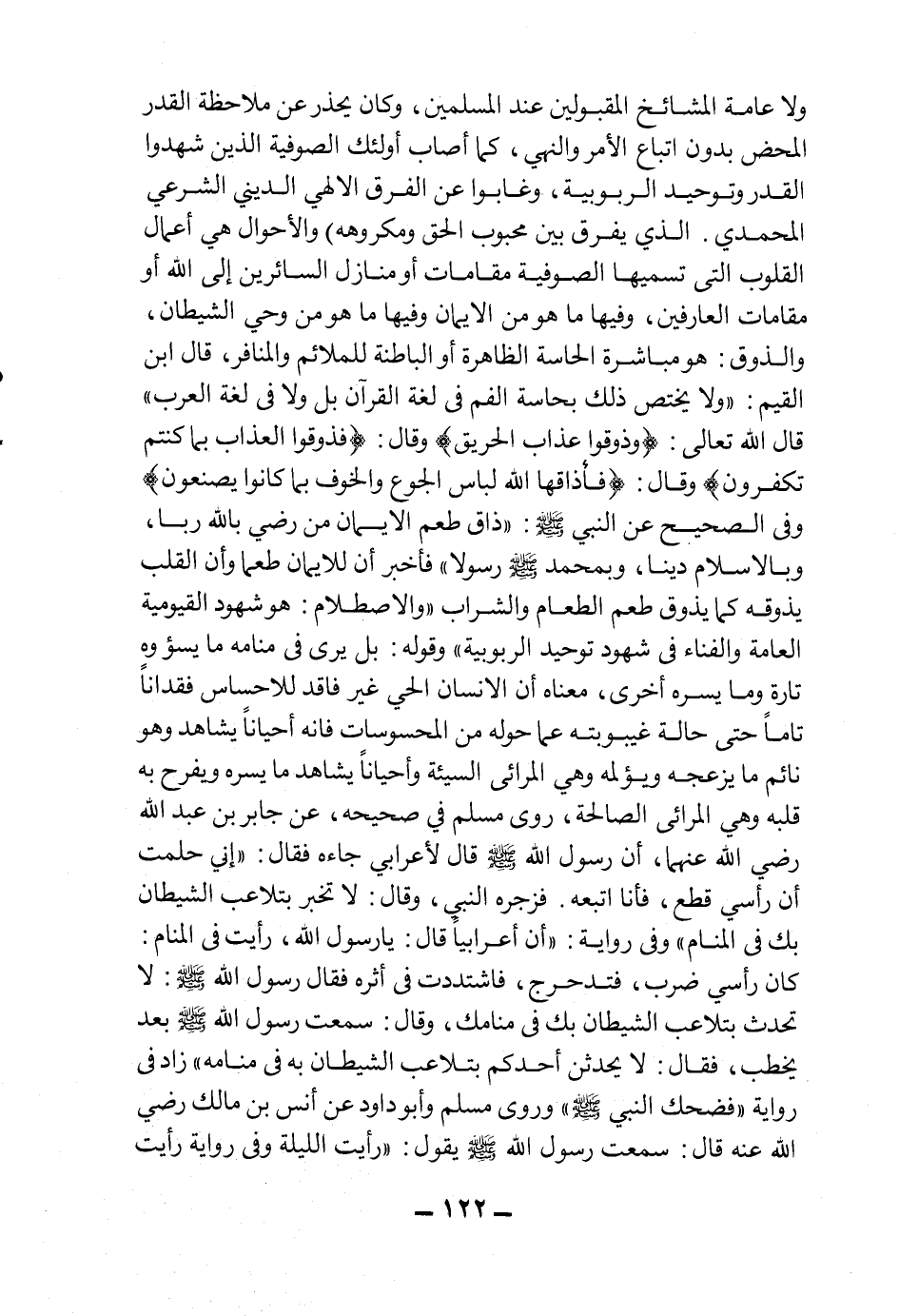 ولا عامة المشائخ المقبولين عند المسلمين، وكان يحذر عن ملاحظة القدر المحض بدون اتباع الأمر والنهي، كما أصاب أولئك الصوفية الذين شهدوا القدر وتوحيد الربوبية، وغابوا عن الفرق الإلهي الديني الشرعي المحمدي. الذي يفرق بين محبوب الحق ومكروهه"، والأحوال هي أعمال القلوب التي تسميها الصوفية مقامات أو منازل السائرين إلى الله أو مقامات العارفين، وفيها ما هو من الإيمان وفيها ما هو من وحي الشيطان، والذوق: هو مباشرة الحاسة الظاهرة أو الباطنة للملائم والمنافر، قال ابن القيم: "ولا يختص ذلك بحاسة الفم في لغة القرآن بل ولا في لغة العرب"، قال الله تعالى: {ذُوقُوا عَذَابَ الْحَرِيقِ} ، وقال: {فَذُوقُوا الْعَذَابَ بِمَا كُنْتُمْ تَكْفُرُونَ} ، وقال: {فَأَذَاقَهَا اللَّهُ لِبَاسَ الْجُوعِ وَالْخَوْفِ بِمَا كَانُوا يَصْنَعُونَ} ، وفي الصحيح عن النبي صلى الله عليه وسلم: "ذاق طعم الإيمان من رضي بالله ربا، وبالإسلام دينا، وبمحمد صلى الله عليه وسلم رسولا" فأخبر أن للإيمان طعما وأن القلب يذوقه كما يذوق طعم الطعام والشراب "والاصطلام": هو شهود القيومية العامة والفناء في شهود توحيد الربوبية وقوله: "بل يرى في منامه ما يسؤوه تارة وما يسره أخرى"، معناه أن الإنسان الحي غير فاقد للإحساس فقدانا تاما حتى حالة غيبوبته عما حوله من المحسوسات فإنه أحيانا يشاهد وهو نائم ما يزعجه ويؤلمه وهي المرائي السيئة وأحيانا يشاهد ما يسره ويفرح به قلبه وهي المرائي الصالحة، روى مسلم في صحيحه، عن جابر بن عبد الله رضي الله عنهما، أن رسول الله صلى الله عليه وسلم قال لأعرابي جاءه فقال: "إني حلمت أن رأسي قطع، فأنا أتبعه. فزجره النبي صلى الله عليه وسلم، وقال: لا تخبر بتلاعب الشيطان بك في المنام" وفي رواية: "أن أعرابيا قال: يا رسول الله، رأيت في المنام: كان رأسي ضرب، فتدحرج، فاشتددت في أثره فقال رسول الله صلى الله عليه وسلم: لا تحدث بتلاعب الشيطان بك في منامك"، وقال: سمعت رسول الله صلى الله عليه وسلم بعد يخطب، فقال: "لا يحدثن أحدكم بتلاعب الشيطان به في منامه" زاد في رواية "فضحك النبي صلى الله عليه وسلم "، وروى مسلم وأبو داود عن أنس بن مالك رضي الله عنه قال: سمعت رسول الله صلى الله عليه وسلم يقول: "رأيت الليلة - وفى رواية - رأيت