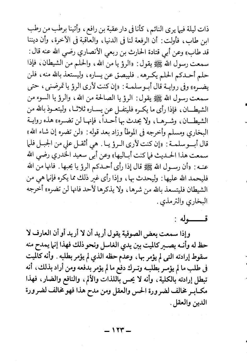 وإذا سمعت بعض الصوفية يقول: أريد أن لا أريد، أو أن العارف لا حظ له وأنه يصير كالميت بين يدي الغاسل ونحو ذلك فهذا إنما يمدح منه سقوط إرادته التي لم يؤمر بها، وعدم حظه الذي لم يؤمر بطلبه، وأنه كالميت في طلب ما لم يؤمر بطلبه وترك دفع ما لم يؤمر بدفعه ومن أراد بذلك، أنه تبطل إرادته بالكلية، وأنه لا يحس باللذات والألم، والنافع والضار، فهذا مكابر مخالف لضرورة الحس والعقل ومن مدح هذا فهو مخالف لضرورة الدين والعقل.