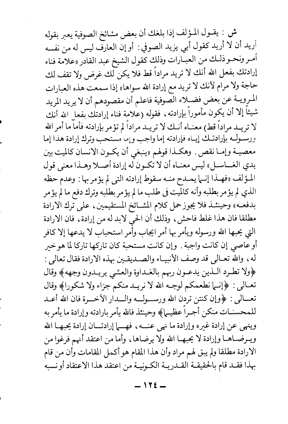ش: يقول المؤلف إذا بلغك أن بعض مشائخ الصوفية يعبر بقولهأريد أن لا أريد كقول أبي يزيد الصوفي: أو إن العارف ليس له من نفسه أمر ونحو ذلك من العبارات وذلك كقول الشيخ عبد القادر "علامة فناء إرادتك بفعل الله أنك لا تريد مرادا قط فلا يكن لك غرض ولا تقف لك حاجة ولا مرام لأنك لا تريد مع إرادة الله سواها"، إذا سمعت هذه العبارات المروية عن بعض فضلاء الصوفية فاعلم أن مقصودهم أن لا يريد المريد شيئا إلا أن يكون مأمورا بإرادته، فقوله: "علامة فناء إرادتك بفعل الله أنك لا تريد مرادا قط" معناه أنك لا تريد مرادا لم تؤمر بإرادته فأما ما أمر الله ورسوله بإرادتك إياه فإرادته إما واجب وإما مستحب وترك إرادة هذا إما معصية وإما نقص. وهكذا قولهم "ينبغي أن يكون الإنسان كالميت بين يدي الغاسل" ليس معناه أن لا تكون له إرادة أصلا وهذا معنى قول المؤلف: "فهذا إنما يمدح منه سقوط إرادته التي لم يؤمر بها، وعدم حظه الذي لم يؤمر بطلبه وأنه كالميت في طلب ما لم يؤمر بطلبه وترك دفع ما لم يؤمر بدفعه"، وحينئذ فلا يجوز حمل كلام المشائخ المستقيمين، على ترك الإرادة مطلقا فإن هذا غلط فاحش، وذلك أن الحي لابد له من إرادة، فإن الإرادة التي يحبها الله ورسوله ويأمر بها أمر إيجاب وأمر استحباب لا يدعها إلا كافر أو عاصي إن كانت واجبة، وإن كانت مستحبة كان تاركها تاركا لما هو خير له، والله تعالى قد وصف الأنبياء والصديقين بهذه الإرادة فقال تعالى: {وَلا تَطْرُدِ الَّذِينَ يَدْعُونَ رَبَّهُمْ بِالْغَدَاةِ وَالْعَشِيِّ يُرِيدُونَ وَجْهَهُ} ، وقال تعالى: {إِنَّمَا نُطْعِمُكُمْ لِوَجْهِ اللَّهِ لا نُرِيدُ مِنْكُمْ جَزَاءً وَلا شُكُوراً} ، وقال تعالى: {وَإِنْ كُنْتُنَّ تُرِدْنَ اللَّهَ وَرَسُولَهُ وَالدَّارَ الْآخِرَةَ فَإِنَّ اللَّهَ أَعَدَّ لِلْمُحْسِنَاتِ مِنْكُنَّ أَجْراً عَظِيماً} ، وحينئذ فالله يأمر بإرادته وإرادة ما يأمر به وينهى عن إرادة غيره وإرادة ما نهى عنه، فهما إرادتان إرادة يحبها الله ويرضاها وإرادة لا يحبها الله ولا يرضاها، وأما من اعتقد أنهم فرغوا من الإرادة مطلقا ولم يبق لهم مراد وأن هذا المقام هو أكمل المقامات وأن من قام بهذا فقد قام بالحقيقة القدرية الكونية من اعتقد هذا الاعتقاد أو نسبه