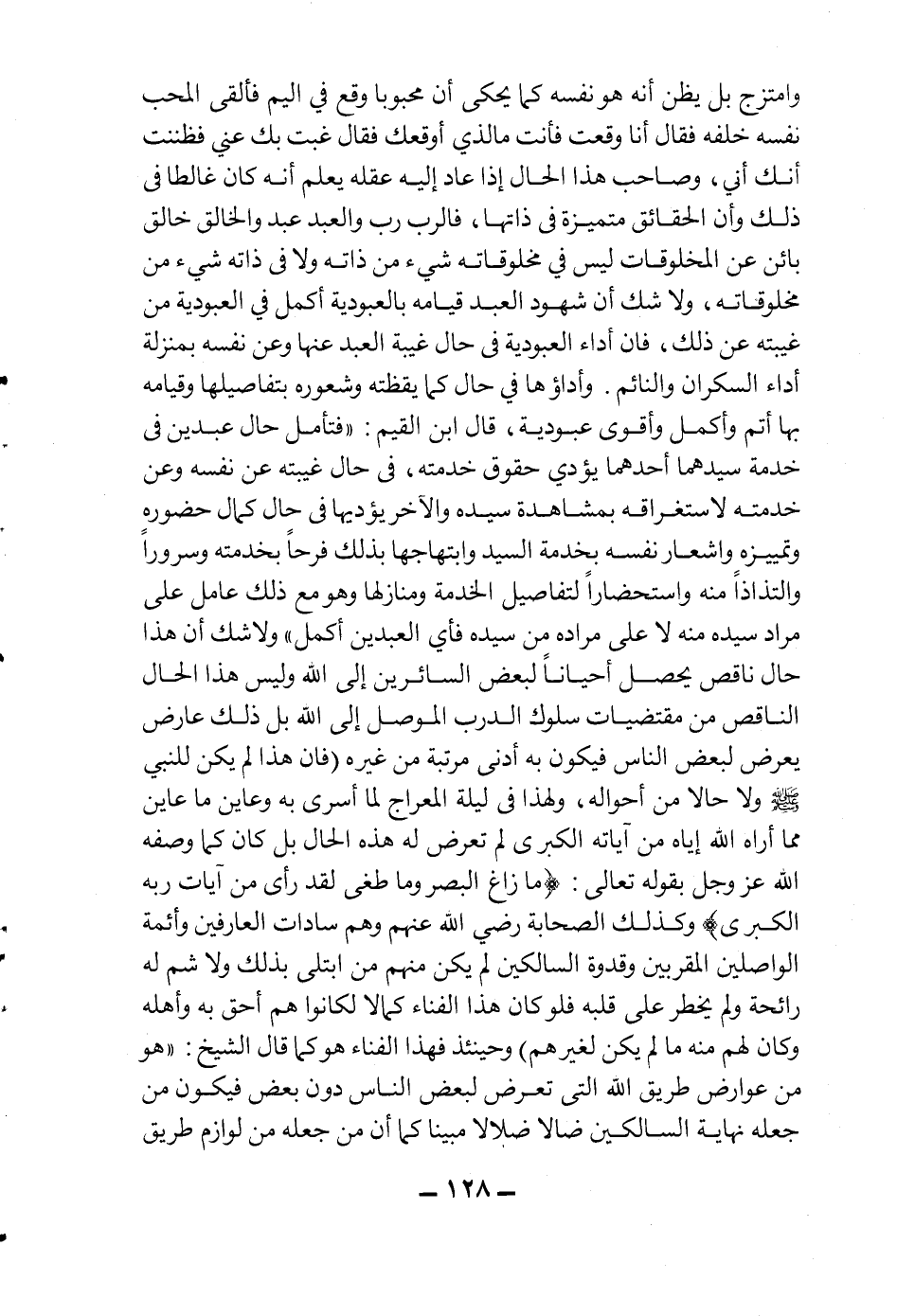 وامتزج بل يظن أنه هو نفسه كما يحكى "أن محبوبا وقع في اليم فألقى المحب نفسه خلفه فقال: أنا وقعت فأنت ما الذي أوقعك؟، فقال: غبت بك عني فظننت أنك أني"، وصاحب هذا الحال إذا عاد إليه عقله يعلم أنه كان غالطا في ذلك وأن الحقائق متميزة في ذاتها، فالرب رب والعبد عبد والخالق خالق بائن عن المخلوقات ليس في مخلوقاته شيء من ذاته ولا في ذاته شيء من مخلوقاته، ولا شك أن شهود العبد قيامه بالعبودية أكمل في العبودية من غيبته عن ذلك، فإن أداء العبودية في حال غيبة العبد عنها وعن نفسه بمنزلة أداء السكران والنائم. وأداؤها في حال كما يقظته وشعوره بتفاصيلها وقيامه بها أتم وأكمل وأقوى عبودية، قال ابن القيم: "فتأمل حال عبدين في خدمة سيدهما أحدهما يؤدي حقوق خدمته في حال غيبته عن نفسه وعن خدمته لاستغراقه بمشاهدة سيده، والآخر يؤديها في حال كمال حضوره وتمييزه وإشعار نفسه بخدمة السيد وابتهاجها بذلك فرحا بخدمته وسرورا والتذاذا منه واستحضارا لتفاصيل الخدمة ومنازلها وهو مع ذلك عامل على مراد سيده منه لا على مراده من سيده فأي العبدين أكمل" ولاشك أن هذا حال ناقص يحصل أحيانا لبعض السائرين إلى الله وليس هذا الحال الناقص من مقتضيات سلوك الدرب الموصل إلى الله بل ذلك عارض يعرض لبعض الناس فيكون به أدنى مرتبة من غيره {فإن هذا لم يكن للنبي صلى الله عليه وسلم ولا حالا من أحواله، ولهذا في ليلة المعراج لما أسرى به وعاين ما عاين مما أراه الله إياه من آياته الكبرى لم تعرض له هذه الحال بل كان كما وصفه لله عز وجل بقوله تعالى: {مَا زَاغَ الْبَصَرُ وَمَا طَغَى، لَقَدْ رَأَى مِنْ آيَاتِ رَبِّهِ الْكُبْرَى} ، وكذلك الصحابة رضي الله عنهم وهم سادات العارفين زائمة الواصلين المقربين وقدوة السالكين لم يكن منهم من ابتلي بذلك ولا شم له رائحة ولم يخطر على قلبه فلو كان هذا الفناء كمالا لكانوا هم أحق به وأهله وكان لهم منه ما لم يكن لغيرهم"، وحينئذ فهذا الفناء هو كما قال الشيخ: "هو من عوارض طريق الله التي تعرض لبعض الناس دون بعض فيكون من جعله نهاية السالكين ضالا ضلالا مبينا كما أن من جعله من لوازم طريق