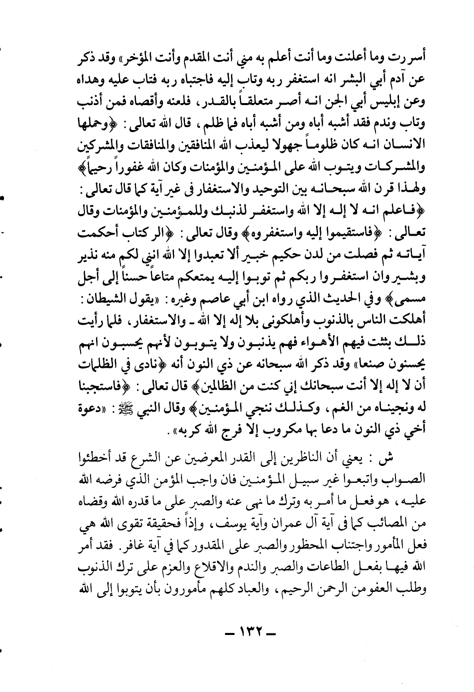 أسررت وما أعلنت وما أنت أعلم به مني أنت المقدم وأنت المؤخر"، وقد ذكر عن آدم أبي البشر أنه استغفر ربه وتاب إليه فاجتباه ربه فتاب عليه وهداه وعن إبليس أبي الجن أنه أصر متعلقا بالقدر، فلعنه وأقصاه فمن أذنب وتاب وندم فقد أشبه أباه ومن أشبه أباه فما ظلم، قال الله تعالى: {وَحَمَلَهَا الإِنْسَانُ إِنَّهُ كَانَ ظَلُوماً جَهُولاً، لِيُعَذِّبَ اللَّهُ الْمُنَافِقِينَ وَالْمُنَافِقَاتِ وَالْمُشْرِكِينَ وَالْمُشْرِكَاتِ وَيَتُوبَ اللَّهُ عَلَى الْمُؤْمِنِينَ وَالْمُؤْمِنَاتِ وَكَانَ اللَّهُ غَفُوراً رَحِيماً} ، ولهذا قرن الله سبحانه بين التوحيد والاستغفار في غير آية كما قال تعالى: {فَاعْلَمْ أَنَّهُ لا إله إلا اللَّهُ وَاسْتَغْفِرْ لِذَنْبِكَ وَلِلْمُؤْمِنِينَ وَالْمُؤْمِنَاتِ} ، وقال تعالى: {فَاسْتَقِيمُوا إِلَيْهِ وَاسْتَغْفِرُوهُ} ، وقال تعالى: {الر كِتَابٌ أُحْكِمَتْ آيَاتُهُ ثُمَّ فُصِّلَتْ مِنْ لَدُنْ حَكِيمٍ خَبِيرٍ، أَلاَّ تَعْبُدُوا إِلاَّ اللَّهَ إِنَّنِي لَكُمْ مِنْهُ نَذِيرٌ وَبَشِيرٌ، وَأَنِ اسْتَغْفِرُوا رَبَّكُمْ ثُمَّ تُوبُوا إِلَيْهِ يُمَتِّعْكُمْ مَتَاعاً حَسَناً إِلَى أَجَلٍ مُسَمّىً} ، وفي الحديث الذي رواه ابن أبي عاصم وغيره: "يقول الشيطان: أهلكت الناس بالذنوب وأهلكوني بلا إله إلا الله والاستغفار، فلما رأيت ذلك بثثت فيهم الأهواء فهم يذنبون ولا يتوبون لأنهم يحسبون أنهم يحسنون صنعا"، وقد ذكر الله سبحانه عن ذي النون أنه {نَادَى فِي الظُّلُمَاتِ أَنْ لا إله إلا أَنْتَ سُبْحَانَكَ إِنِّي كُنْتُ مِنَ الظَّالِمِينَ} ، قال تعالى: {فَاسْتَجَبْنَا لَهُ وَنَجَّيْنَاهُ مِنَ الْغَمِّ وَكَذَلِكَ نُنْجِي الْمُؤْمِنِينَ} ، وقال النبي صلى الله عليه وسلم: "دعوة أخي ذي النون ما دعا بها مكروب إلا فرج الله كربه".