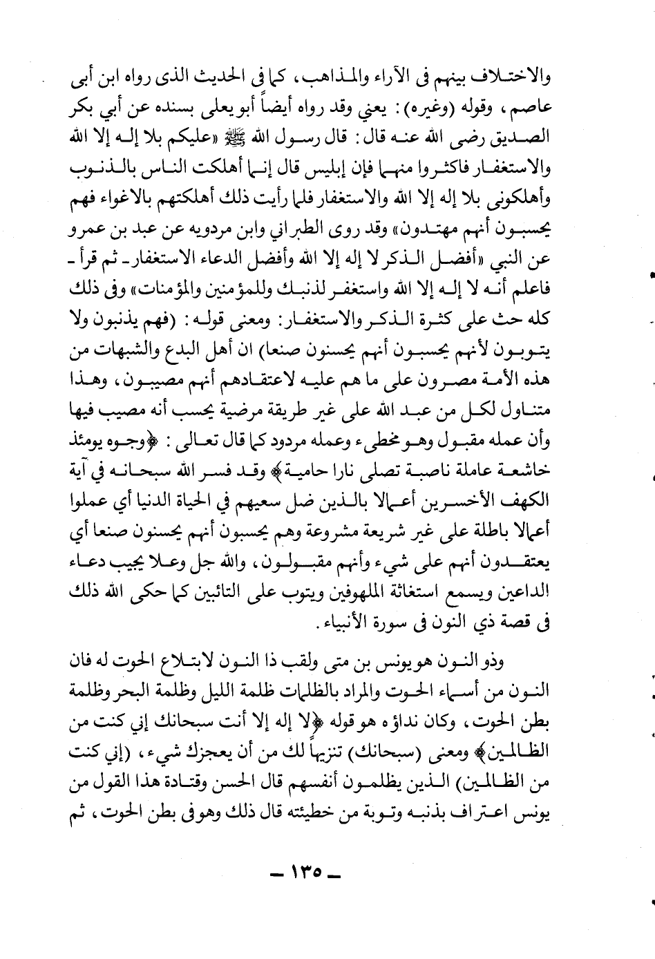 والاختلاف بينهم في الآراء والمذاهب، كما في الحديث الذي رواه ابن أبي عاصم، وقوله "وغيره": يعني وقد رواه أيضا أبو يعلى بسنده عن أبي بكر الصديق رضي الله عنه قال: قال رسول لله صلى الله عليه وسلم: "عليكم بلا إله إلا الله والاستغفار فأكثروا منهما فإن إبليس قال إنما أهلكت الناس بالذنوب وأهلكوني بلا إله إلا الله والاستغفار فلما رأيت ذلك أهلكتهم بالإغواء فهم يحسبون أنهم مهتدون" وقد روى الطبراني وابن مردويه عن عبد بن عمرو عن النبي صلى الله عليه وسلم:"أفضل الذكر لا إله إلا الله وأفضل الدعاء الاستغفار - ثم قرأ- {فَاعْلَمْ أَنَّهُ لا إله إلا اللَّهُ وَاسْتَغْفِرْ لِذَنْبِكَ وَلِلْمُؤْمِنِينَ وَالْمُؤْمِنَاتِ} " وفى ذلك كله حث على كثرة الذكر والاستغفار: ومعنى قوله: "فهم يذنبون ولا يتوبون لأنهم يحسبون أنهم يحسنون صنعا" أن أهل البدع والشبهات من هذه الأمة مصرون على ما هم عليه لاعتقادهم أنهم مصيبون، وهذا متناول لكل من عبد الله على غير طريقة مرضية يحسب أنه مصيب فيها وأن عمله مقبول وهو مخطىء وعمله مردود كما قال تعالى: {وُجُوهٌ يَوْمَئِذٍ خَاشِعَةٌ، عَامِلَةٌ نَاصِبَةٌ، تَصْلَى نَاراً حَامِيَةً} وقد فسر الله سبحانه في آية الكهف الأخسرين أعمالا بالذين ضل سعيهم في الحياة الدنيا أي عملوا أعمالا باطلة على غير شريعة مشروعة وهم يحسبون أنهم يحسنون صنعا أي يعتقدون أنهم على شيء وأنهم مقبولون، والله جل وعلا يجيب دعاء الداعين ويسمع استغاثة الملهوفين ويتوب على التائبين كما حكى الله ذلك في قصة ذي النون في سورة الأنبياء.