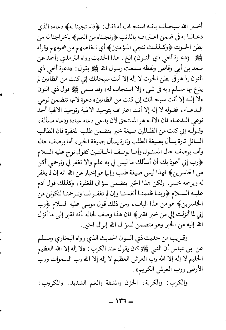 أخبر الله سبحانه بأنه استجاب له فقال: {فَاسْتَجَبْنَا لَهُ} دعاءه الذي دعانا به في ضمن اعترافه بالذنب {وَنَجَّيْنَاهُ مِنَ الْغَمِّ} بإخراجنا له من بطن الحوت {وَكَذَلِكَ نُنْجِي الْمُؤْمِنِينَ} أي نخلصهم من همومهم وقوله صلى الله عليه وسلم: "دعوة أخي ذي النون ... الخ ". هذا الحديث رواه الترمذي وأحمد عن سعد بن أبي وقاص ولفظه سمعت رسول لله صلى الله عليه وسلم يقول: "دعوة أخي ذي النون إذ هو في بطن الحوت لا إله إلا أنت سبحانك إني كنت من الظالمين لم يدع بها مسلم ربه في شيء إلا استجاب له"، وقد سمى صلى الله عليه وسلم قول ذي النون "لا إله إلا أنت سبحانك إني كنت من الظالمين" دعوة لأنها تتضمن نوعي الدعاء، فقوله: "لا إله إلا أنت" اعتراف بتوحيد الإلهية وتوحيد الإلهية أحد نوعي الدعاء فإن الإله هو المستحق لأن يدعى دعاء عبادة ودعاء مسألة، وقوله: "إني كنت من الظالمين" صيغة خبر يتضمن طلب المغفرة فإن الطالب السائل تارة يسأل بصيغة الطلب وتارة يسأل بصيغة الخبر، إما بوصف حاله وإما بوصف حال المسئول وإما بوصف الحالتين، كقول نوح عليه السلام: {رَبِّ إِنِّي أَعُوذُ بِكَ أَنْ أَسْأَلَكَ مَا لَيْسَ لِي بِهِ عِلْمٌ وَإِلاَّ تَغْفِرْ لِي وَتَرْحَمْنِي أَكُنْ مِنَ الْخَاسِرِينَ} فهذا ليس صيغة طلب وإنما هو إخبار عن الله أنه إن لم يغفر له ويرحمه خسر، ولكن هذا الخبر يتضمن سؤال المغفرة، وكذلك قول آدم عليه السلام: {رَبَّنَا ظَلَمْنَا أَنْفُسَنَا وَإِنْ لَمْ تَغْفِرْ لَنَا وَتَرْحَمْنَا لَنَكُونَنَّ مِنَ الْخَاسِرِينَ} هو من هذا الباب، ومن ذلك قول موسى عليه السلام: {إِنِّي لِمَا أَنْزَلْتَ إِلَيَّ مِنْ خَيْرٍ فَقِيرٌ} فإن هذا وصف لحاله بأنه فقير إلى ما أنزل الله إليه من الخير وهو متضمن لسؤال الله إنزال الخير.