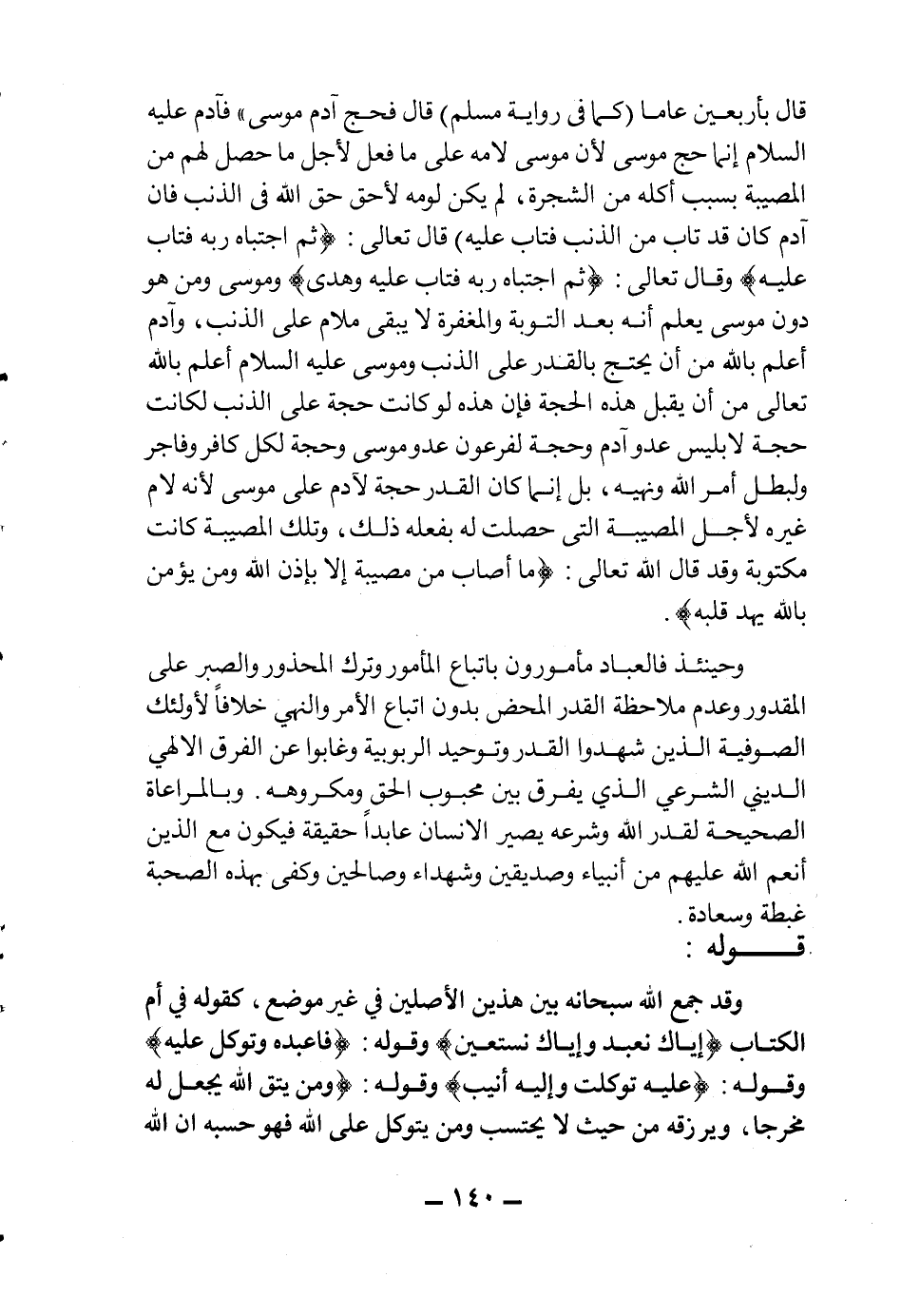 قال بأربعين عاما (كما في رواية مسلم) قال فحج آدم موسى"، فآدم عليه السلام أنما حج موسى لأن موسى لامه على ما فعل لأجل ما حصل لهم من المصيبة بسبب أكله من الشجرة، لم يكن لومه لأحق حق الله في الذنب فإن آدم كان قد تاب من الذنب فتاب عليه. قال تعالى: {ثُمَّ اجْتَبَاهُ رَبُّهُ فَتَابَ عَلَيْهِ وَهَدَى} ، وقال تعالى: {ثُمَّ اجْتَبَاهُ رَبُّهُ فَتَابَ عَلَيْهِ وَهَدَى} ، وموسى ومن هو دون موسى يعلم أنه بعد التوبة والمغفرة لا يبقى ملام على الذنب، وآدم أعلم بالله من أن يحتج بالقدر على الذنب وموسى عليه السلام أعلم بالله تعالى من أن يقبل هذه الحجة فإن هذه لو كانت حجة على الذنب لكانت حجة لإبليس عدو آدم وحجة لفرعون عدو موسى وحجة لكل كافر وفاجر ولبطل أمر الله ونهيه، بل إنما كان القدر حجة لآدم على موسى لأنه لام غيره لأجل المصيبة التي حصلت له بفعله ذلك، وتلك المصيبة كانت مكتوبة وقد قال الله تعالى: {مَا أَصَابَ مِنْ مُصِيبَةٍ إِلَّا بِإِذْنِ اللَّهِ وَمَنْ يُؤْمِنْ بِاللَّهِ يَهْدِ قَلْبَهُ} .
