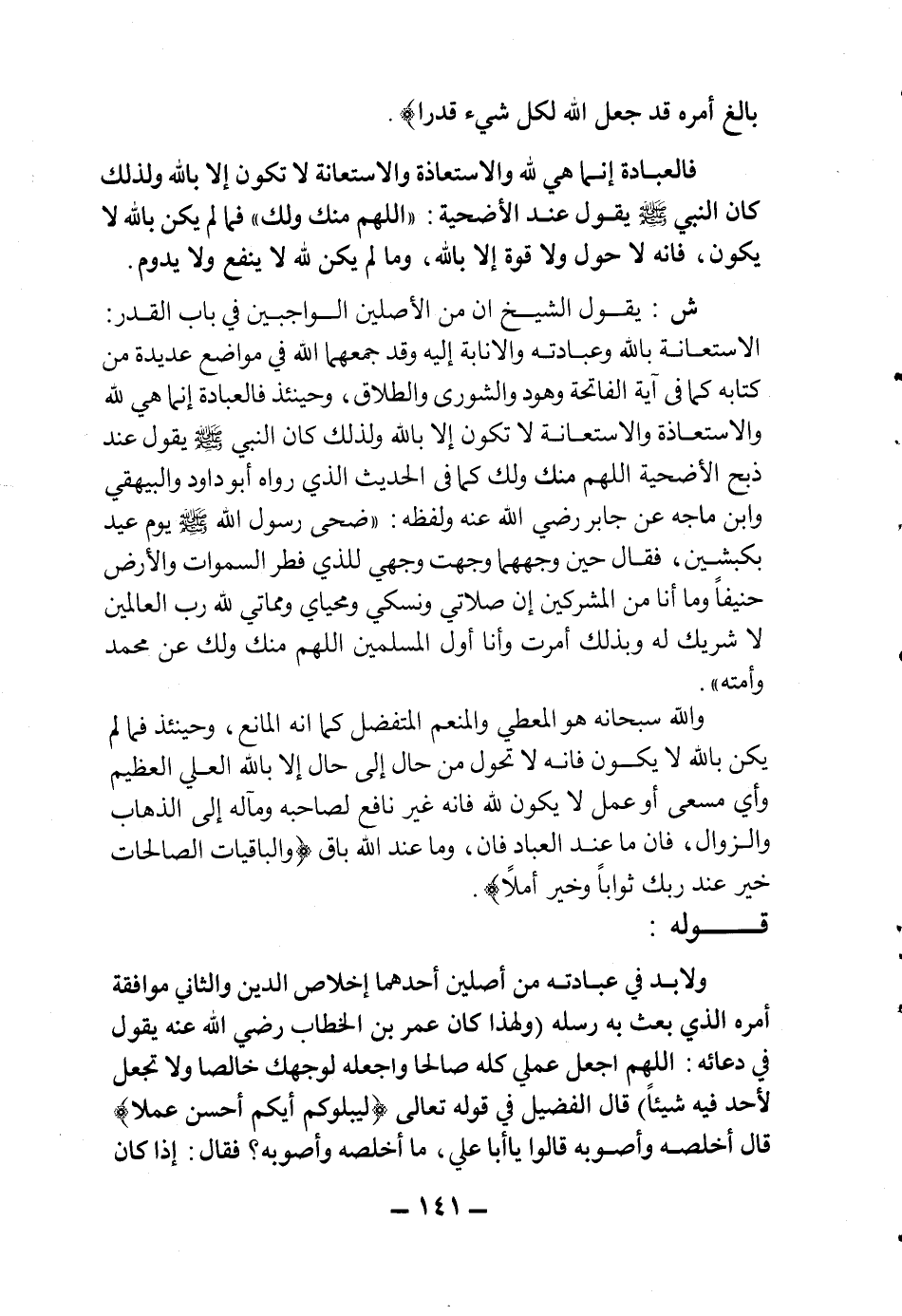 ش: يقول الشيخ أن من الأصلين الواجبين في باب القدر: الاستعانة بالله وعبادته والإنابة إليه وقد جمعهما الله في مواضع عديدة من كتابه كما في آية الفاتحة وهود والشورى والطلاق، وحينئذ فالعبادة إنما هي لله والاستعاذة والاستعانة لا تكون إلا بالله ولذلك كان النبي صلى الله عليه وسلم يقول عند ذبح الأضحية: "اللهم منك ولك" كما في الحديث الذي رواه أبو داود والبيهقي وابن ماجه عن جابر رضي الله عنه ولفظه: "ضحى رسول الله صلى الله عليه وسلم يوم عيد بكبشين، فقال حين وجههما: وجهت وجهي للذي فطر السموات والأرض حنيفا وما أنا من المشركين إن صلاتي ونسكي ومحياي ومماتي لله رب العالمين لا شريك له وبذلك أمرت وأنا أول المسلمين اللهم منك ولك عن محمد وأمته".