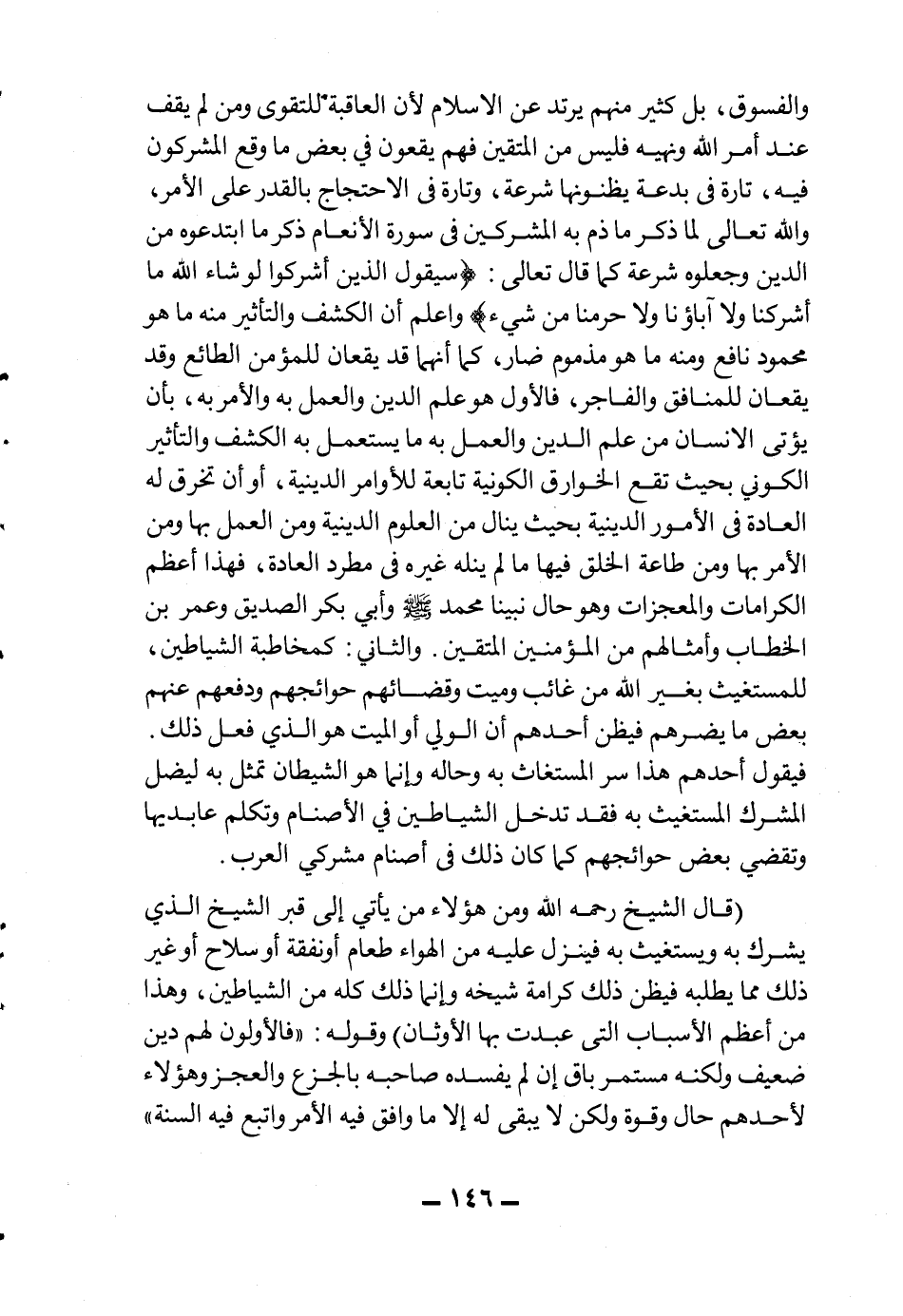 والفسوق، بل كثير منهم يرتد عن الإسلام لأن العاقبة للتقوى ومن لم يقف عند أمر الله ونهيه فليس من المتقين فهم يقعون في بعض ما وقع المشركون فيه، تارة في بدعة يظنونها شرعة، وتارة في الاحتجاج بالقدر على الأمر، والله تعالى لما ذكر ما ذم به المشركين في سورة الأنعام ذكر ما ابتدعوه من الدين وجعلوه شرعة كما قال تعالى: {سَيَقُولُ الَّذِينَ أَشْرَكُوا لَوْ شَاءَ اللَّهُ مَا أَشْرَكْنَا وَلا آبَاؤُنَا وَلا حَرَّمْنَا مِنْ شَيْءٍ} ، واعلم أن الكشف والتأثير منه ما هو محمود نافع ومنه ما هو مذموم ضار، كما أنهما قد يقعان للمؤمن الطائع وقد يقعان للمنافق والفاجر، فالأول هو علم الدين والعمل به والأمر به، بأن يؤتى الإنسان من علم الدين والعمل به ما يستعمل به الكشف والتأثير الكوني بحيث تقع الخوارق الكونية تابعة للأوامر الدينية، أو أن تخرق له العادة في الأمور الدينية بحيث ينال من العلوم الدينية ومن العمل بها ومن الأمر بها ومن طاعة الخلق فيها ما لم ينله غيره في مطرد العادة، فهذا أعظم الكرامات والمعجزات وهو حال نبينا محمد صلى الله عليه وسلم وأبي بكر الصديق وعمر بن الخطاب وأمثالهم من المؤمنين المتقين. والثاني: كمخاطبة الشياطين، للمستغيث بغير الله من غائب وميت وقضائهم حوائجهم ودفعهم عنهم بعض ما يضرهم فيظن أحدهم أن الولي أو الميت هو الذي فعل ذلك فيقول أحدهم هذا سر المستغاث به وحاله وإنما هو الشيطان تمثل به ليضل المشرك المستغيث به فقد تدخل الشياطين في الأصنام وتكلم عابديها وتقضي بعض حوائجهم كما كان ذلك في أصنام مشركي العرب.