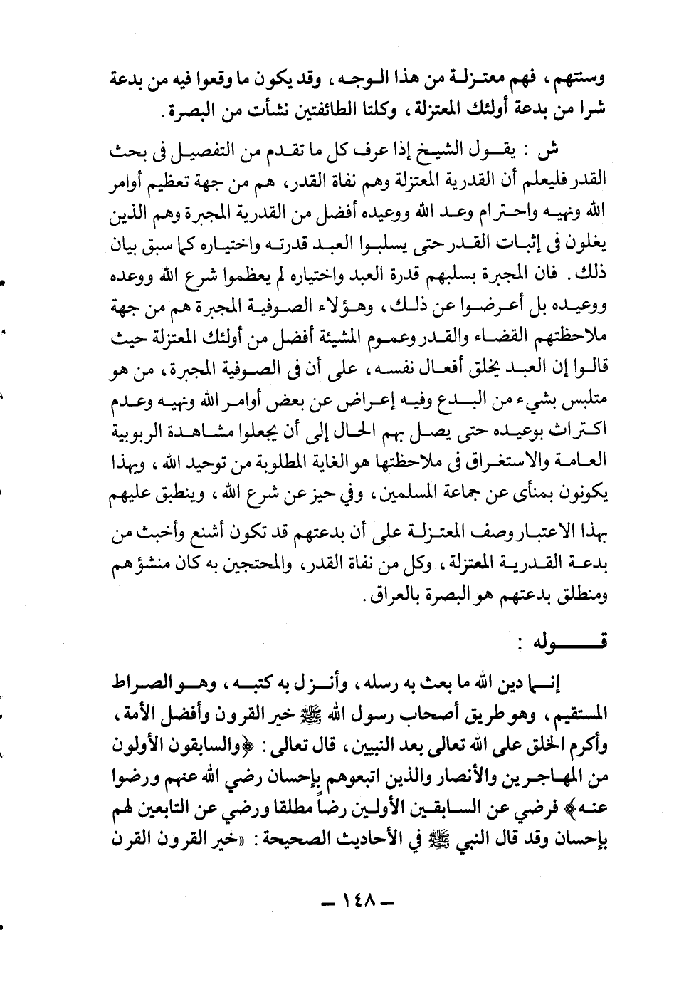 ش: يقول الشيخ إذا عرف كل ما تقدم من التفصيل في بحث القدر فليعلم أن القدرية المعتزلة - وهم نفاة القدر - هم من جهة تعظيم أوامر الله ونهيه واحترام وعد الله ووعيده أفضل من القدرية المجبرة وهم الذين يغلون في إثبات القدر حتى يسلبوا العبد قدرته واختياره كما سبق بيان ذلك. فإن المجبرة بسلبهم قدرة العبد واختياره لم يعظموا شرع الله ووعده ووعيده بل أعرضوا عن ذلك، وهؤلاء الصوفية المجبرة هم من جهة ملاحظتهم القضاء والقدر وعموم المشيئة أفضل من أولئك المعتزلة حيث قالوا إن العبد يخلق أفعال نفسه، على أن في الصوفية المجبرة من هو متلبس بشيء من البدع وفيه إعراض عن بعض أوامر الله ونهيه وعدم اكتراث بوعيده حتى يصل بهم الحال إلى أن يجعلوا مشاهدة الربوبية العامة والاستغراق في ملاحظتها هو الغاية المطلوبة من توحيد الله، وبهذا يكونون بمنأى عن جماعة المسلمين، وفي حيز عن شرع الله، وينطبق عليهم بهذا الاعتبار وصف المعتزلة على أن بدعتهم قد تكون أشنع وأخبث من بدعة القدرية المعتزلة. وكل من نفاة القدر والمحتجين به كان منشؤهم ومنطلق بدعتهم هو البصرة بالعراق.