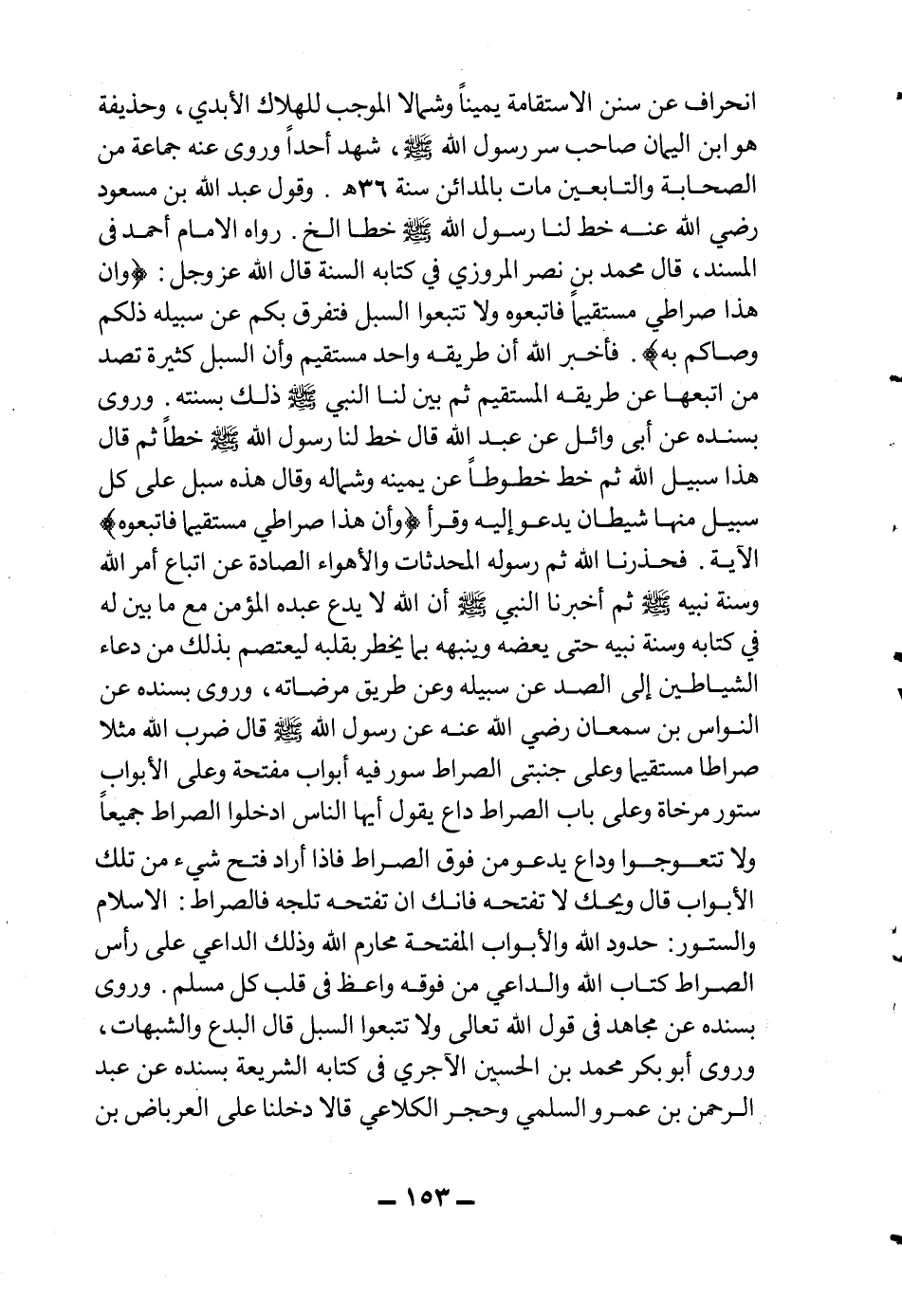 انحراف عن سنن الاستقامة يمينا وشمالا الموجب للهلاك الأبدي، وحذيفة هو ابن اليمان صاحب سر رسول الله صلى الله عليه وسلم، شهد أحدا وروى عنه جماعة من الصحابة والتابعين مات بالمدائن سنة 36هـ. وقول عبد الله بن مسعود رضي الله عنه: "خط لنا رسول الله صلى الله عليه وسلم خطا الخ" رواه الإمام أحمد في المسند، قال محمد بن نصر المروزي في كتابه السنة قال الله عزوجل: {وَأَنَّ هَذَا صِرَاطِي مُسْتَقِيماً فَاتَّبِعُوهُ وَلا تَتَّبِعُوا السُّبُلَ فَتَفَرَّقَ بِكُمْ عَنْ سَبِيلِهِ ذَلِكُمْ وَصَّاكُمْ بِهِ} فأخبر الله أن طريقه واحد مستقيم وأن السبل كثيرة تصد من اتبعها عن طريقه المستقيم ثم بين لنا النبي صلى الله عليه وسلم ذلك بسنته. وروى بسنده عن أبي وائل عن عبد الله قال: "خط لنا رسول الله صلى الله عليه وسلم خطا ثم قال: هذا سبيل الله ثم خط خطوطا عن يمينه وشماله وقال هذه سبل على كل سبيل منها شيطان يدعو إليه وقرأ {وَأَنَّ هَذَا صِرَاطِي مُسْتَقِيماً فَاتَّبِعُوهُ} الآية"،فحذرنا الله ثم رسوله المحدثات والأهواء الصادة عن اتباع أمر الله وسنة نبيه صلى الله عليه وسلم، ثم أخبرنا النبي صلى الله عليه وسلم أن الله لا يدع عبده المؤمن مع ما بين له في كتابه وسنة نبيه حتى يعضه وينبهه بما يخطر بقلبه ليعتصم بذلك من دعاء الشياطين إلى الصد عن سبيله وعن طريق مرضاته، وروى بسنده عن النواس بن سمعان رضي لله عنه عن رسول الله صلى الله عليه وسلم قال: "ضرب الله مثلا صراطا مستقيما وعلى جنبتي الصراط سور فيه أبواب مفتحة وعلى الأبواب ستور مرخاة وعلى باب الصراط داع يقول أيها الناس ادخلوا الصراط جميعا ولا تتعوجوا وداع يدعو من فوق الصراط فإذا أراد فتح شيء من تلك الأبواب قال ويحك لا تفتحه فإنك إن تفتحه تلجه" فالصراط: الإسلام والستور: حدود الله والأبواب المفتحة محارم الله وذلك الداعي على رأس الصراط كتاب الله والداعي من فوقه واعظ في قلب كل مسلم. وروى بسنده عن مجاهد في قول الله تعالى: {وَلا تَتَّبِعُوا السُّبُل} قال البدع والشبهات، وروى أبو بكر محمد بن الحسين الآجري في كتابه الشريعة بسنده عن عبد الرحمن بن عمرو السلمي وحجر الكلاعي قالا دخلنا على العرباض بن