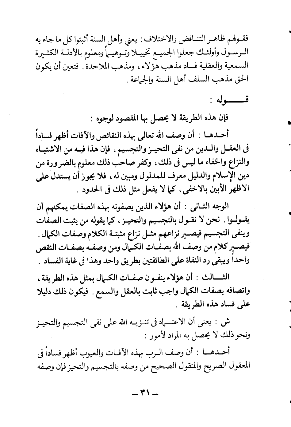 الوجه الثاني: أن هؤلاء الذين يصفونه بهذه الصفات يمكنهم أن يقولوا. نحن لا نقول بالتجسيم والتحيز، كما يقوله من يثبت الصفات وينفي التجسيم فيصير نزاعهم مثل نزاع مثبتة الكلام وصفات الكمال. فيصير كلام من وصف الله بصفات الكمال ومن وصفه بصفات النقص وأحدا ويبقى رد النفاة على الطائفتين بطريق وأحد وهذا في غاية الفساد. الثالث: أن هؤلاء ينفون صفات الكمال بمثل هذه الطريقة، واتصافه صفات الكمال واجب ثابت بالعقل والسمع. فيكون ذلك دليلا على فساد هذه الطريقة.