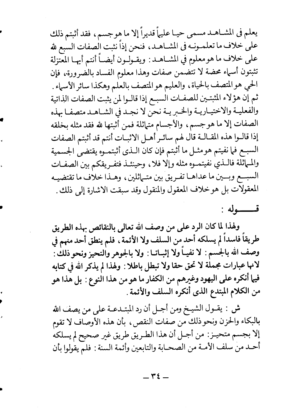 ش: يقول الشيخ: ومن أجل أن رد المبتدعة على من يصف الله بالبكاء والحزن ونحو ذلك من صفات النقص، بأن هذه الأوصاف لا تقوم إلا بجسم متحيز، من أجل أن هذا الطريق طريق غير صحيح لم يسلكه أحد من سلف الأمة من الصحابة والتابعين وأئمة السنة، فلم يقولوا بأن